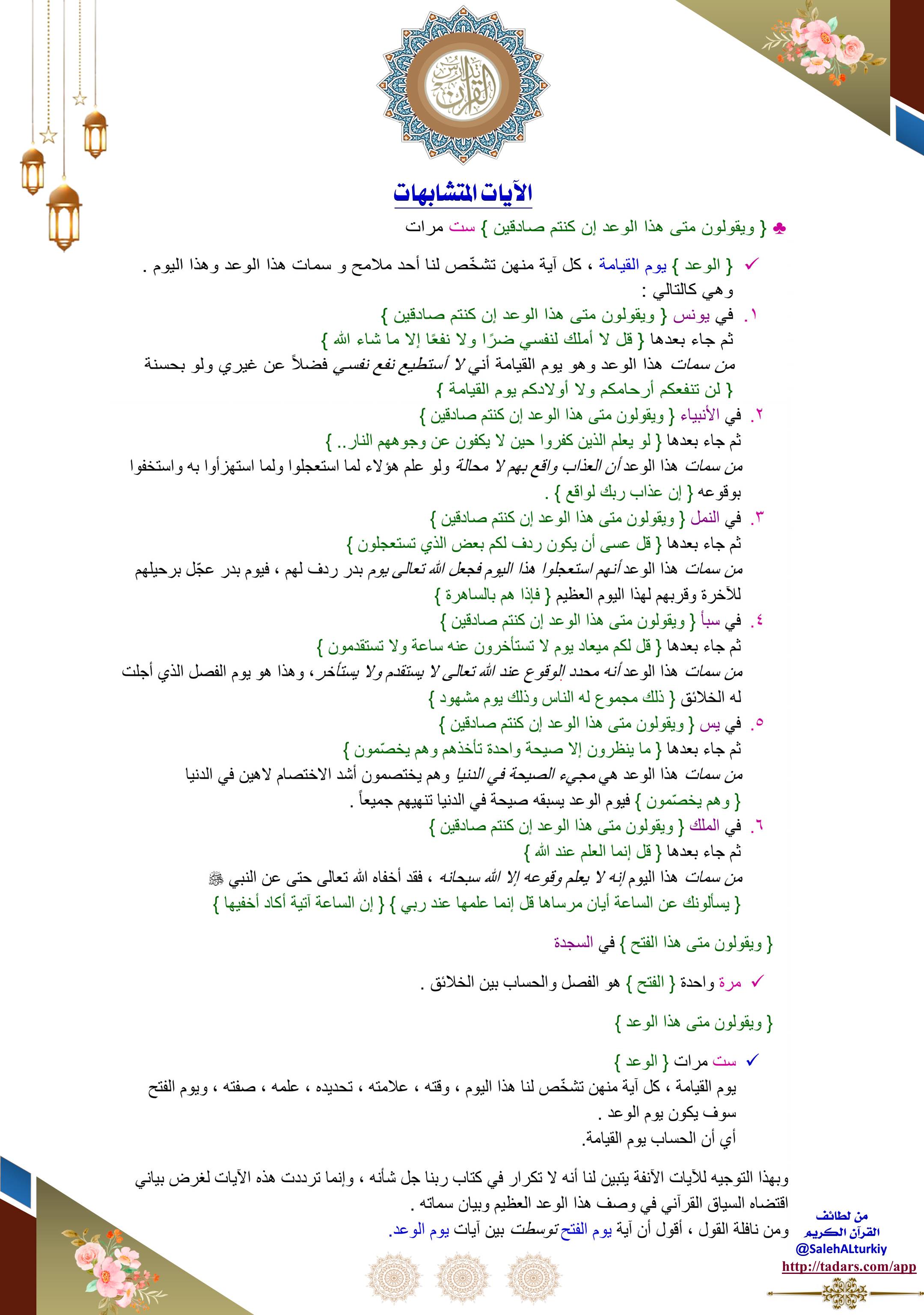 (وَيَقُولُونَ مَتَى هَذَا الْوَعْدُ إِن كُنتُمْ صَادِقِينَ) ست مرات؛ {الوعد} يوم القيامة، كل آية منهن تشخّص لنا أحد ملامح و سمات هذا الوعد وهذا اليوم؛ وهي كالتالي: