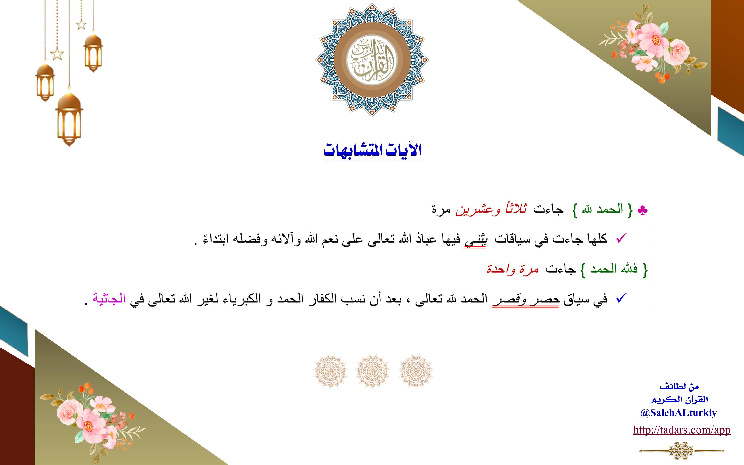 جاءت ثلاثاً وعشرين مرة، كلها جاءت في سياقات يثني فيها عبادُ الله تعالى على نعم الله وآلائه وفضله ابتداءً.