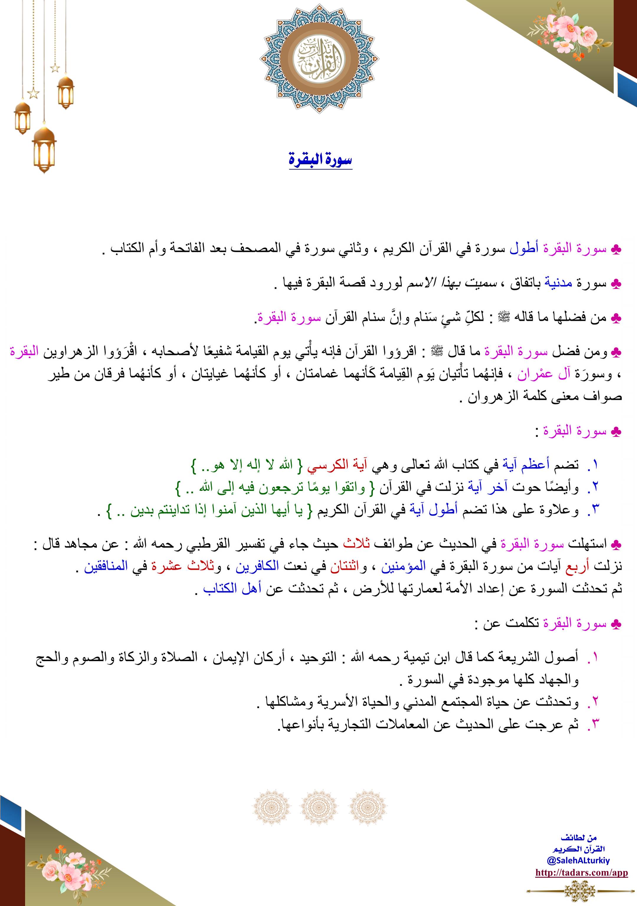 • سورة البقرة أطول سورة في القرآن الكريم، وثاني سورة في المصحف بعد الفاتحة وأم الكتاب.