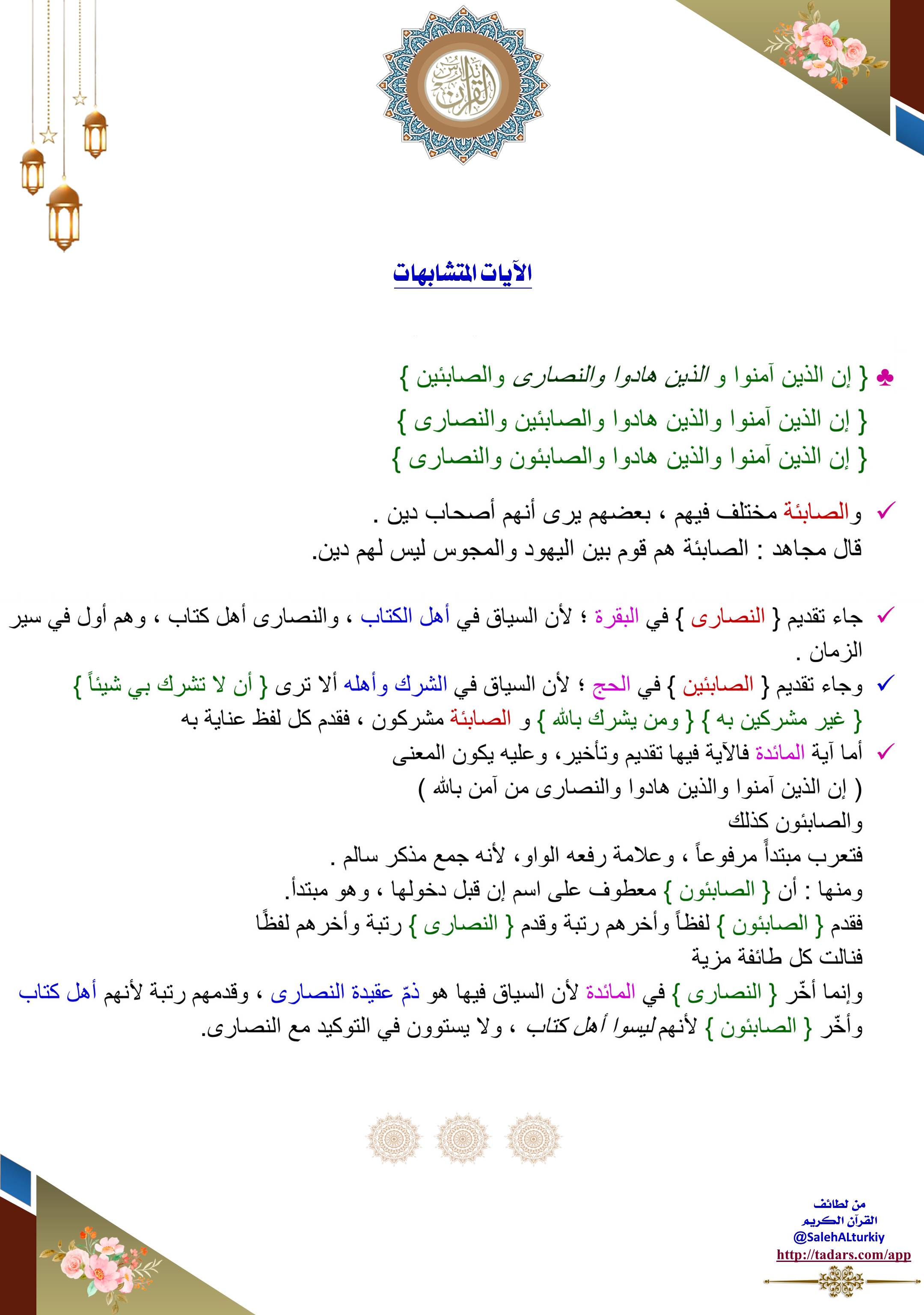 • أما آية المائدة فالآية فيها تقديم وتأخير، وعليه يكون المعنى (إن الذين آمنوا والذين هادوا والنصارى من آمن بالله) والصابئون كذلك؛ فتعرب مبتدأ مرفوعاً، وعلامة رفعه الواو، لأنه جمع مذكر سالم . ومنها : أن {الصابئون} معطوف على اسم إن قبل دخولها، وهو مبتدأ. فقدم {الصابئون} لفظاً وأخرهم رتبة وقدم {النصارى} رتبة وأخرهم لفظًا فنالت كل طائفة مزية، وإنما أخّر {النصارى} في المائدة لأن السياق فيها هو ذمّ عقيدة النصارى، وقدمهم رتبة لأنهم أهل كتاب، وأخّر {الصابئون} لأنهم ليسوا أهل كتاب، ولا يستوون في التوكيد مع النصارى.