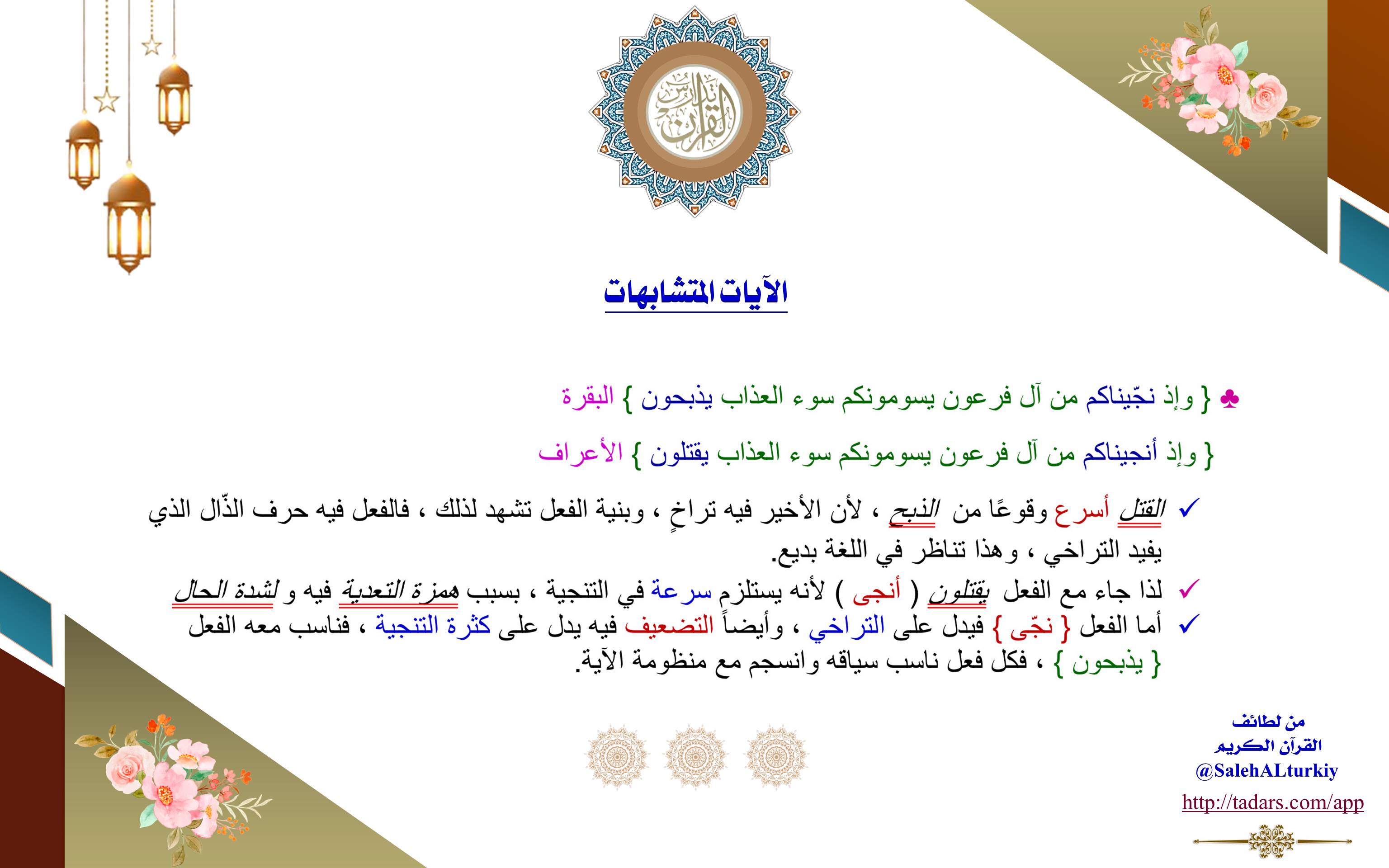 القتل أسرع وقوعًا من الذبح، لأن الأخير فيه تراخٍ، وبنية الفعل تشهد لذلك، فالفعل فيه حرف الذّال الذي يفيد التراخي، وهذا تناظر في اللغة بديع. لذا جاء مع الفعل يقتلون (أنجى) لأنه يستلزم سرعة في التنجية، بسبب همزة التعدية فيه ولشدة الحال. أما الفعل {نجّى} فيدل على التراخي، وأيضاً التضعيف فيه يدل على كثرة التنجية، فناسب معه الفعل {يذبحون}، فكل فعل ناسب سياقه وانسجم مع منظومة الآية.