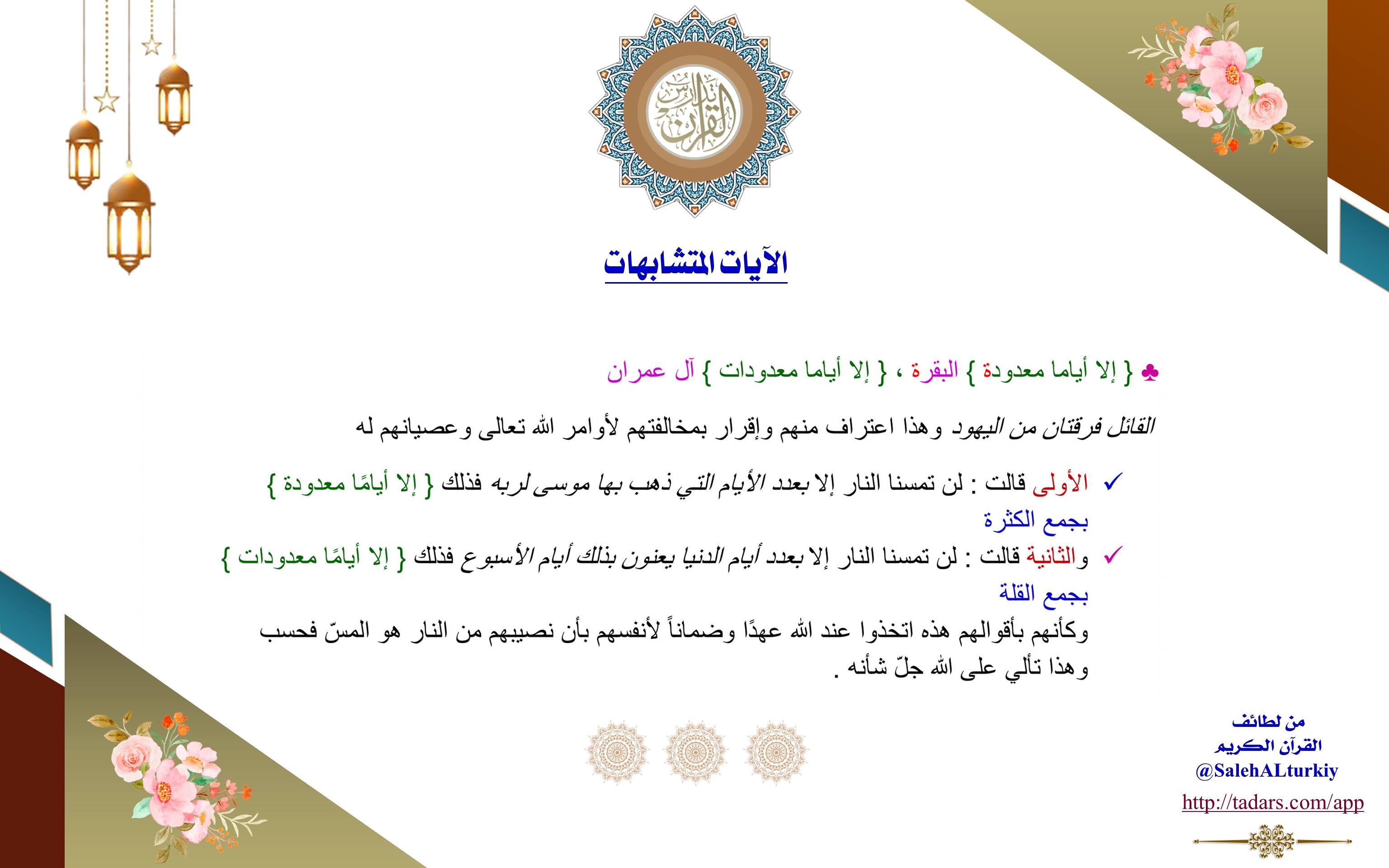 (الأولى) قالت: لن تمسنا النار إلا بعدد الأيام التي ذهب بها موسى لربه فذلك {إِلَّا أَيَّامًا مَّعْدُودَةً} بجمع الكثرة.