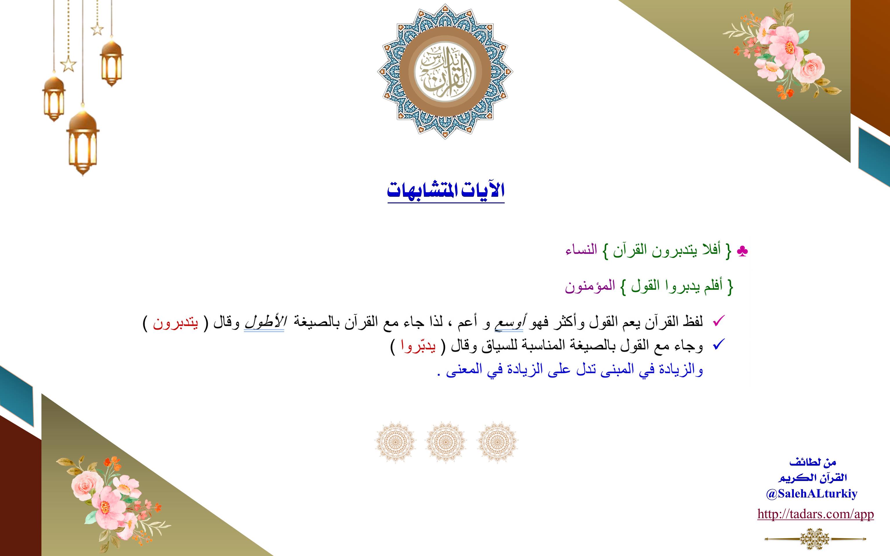 لفظ القرآن يعم القول وأكثر فهو أوسع وأعم، لذا جاء مع القرآن بالصيغة الأطول وقال (يتدبرون)، وجاء مع القول بالصيغة المناسبة للسياق وقال (يدبّروا)، والزيادة في المبنى تدل على الزيادة في المعنى.