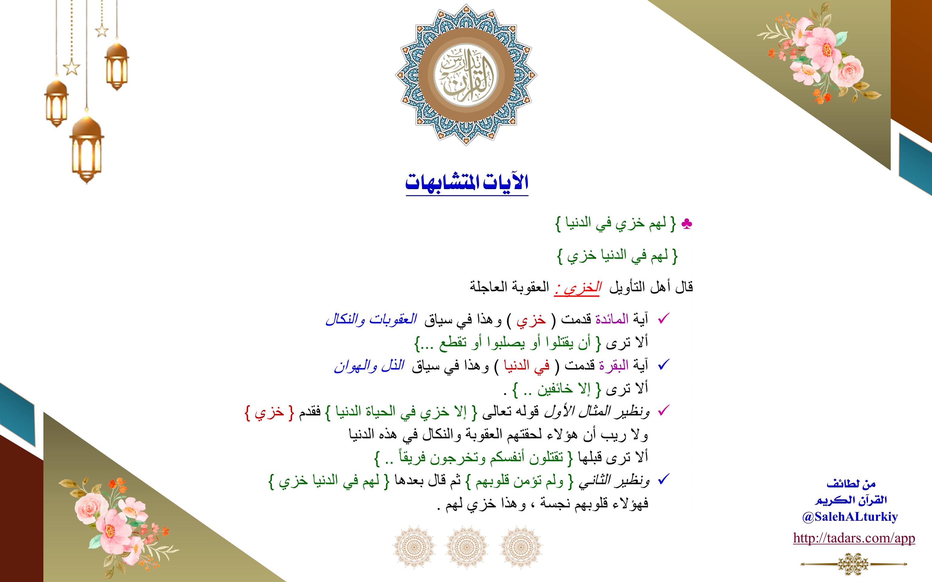 ونظير المثال الأول قوله تعالى: {إلا خزي في الحياة الدنيا} فقدم {خزي} ولا ريب أن هؤلاء لحقتهم العقوبة والنكال في هذه الدنيا؛ ألا ترى قبلها: {تقتلون أنفسكم وتخرجون فريقاً..}.