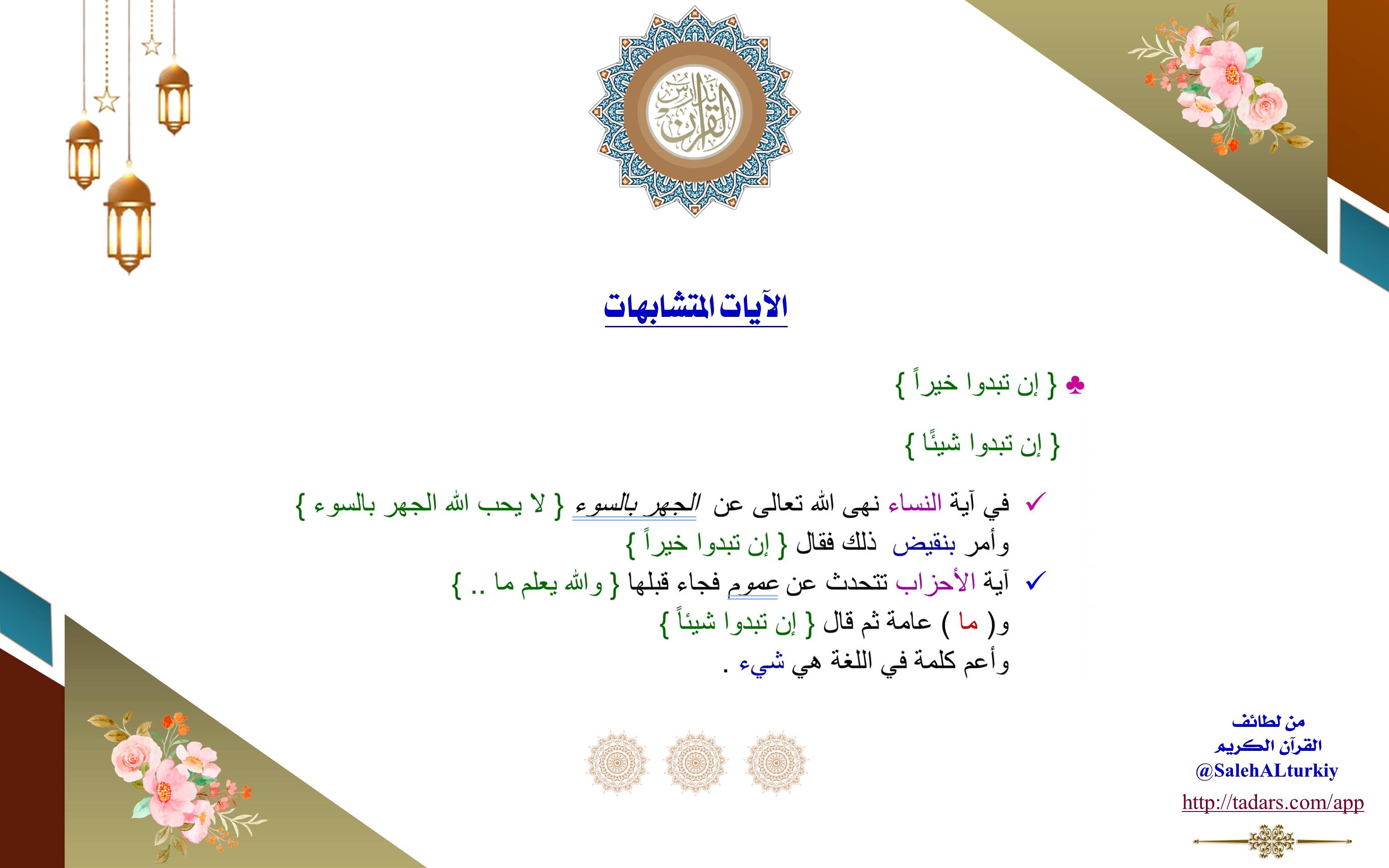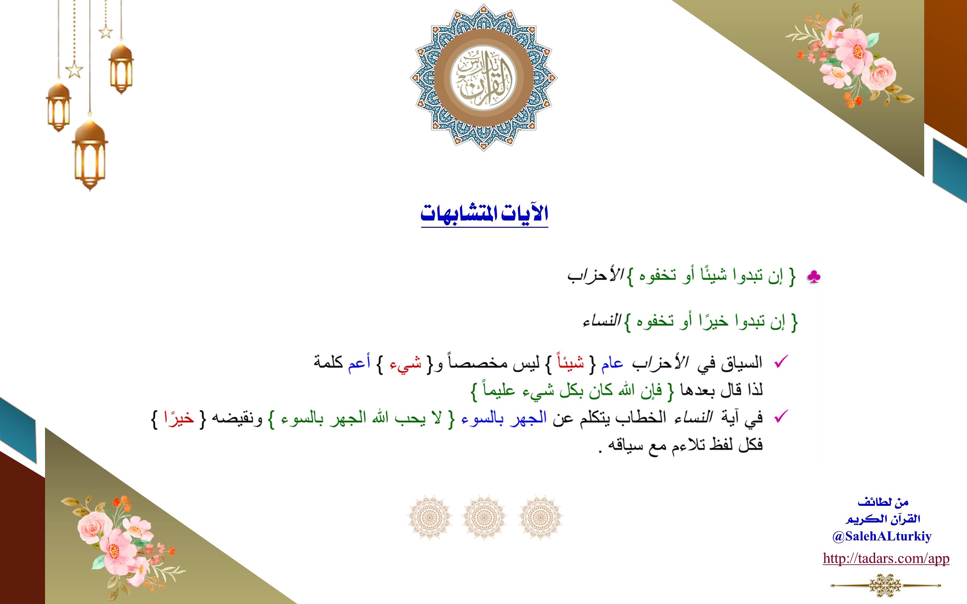 في آية (الأحزاب) تتحدث عن عموم فجاء قبلها {والله يعلم ما..}، و(ما) عامة ثم قال: {إن تبدوا شيئاً}، وأعم كلمة في اللغة هي (شيء).