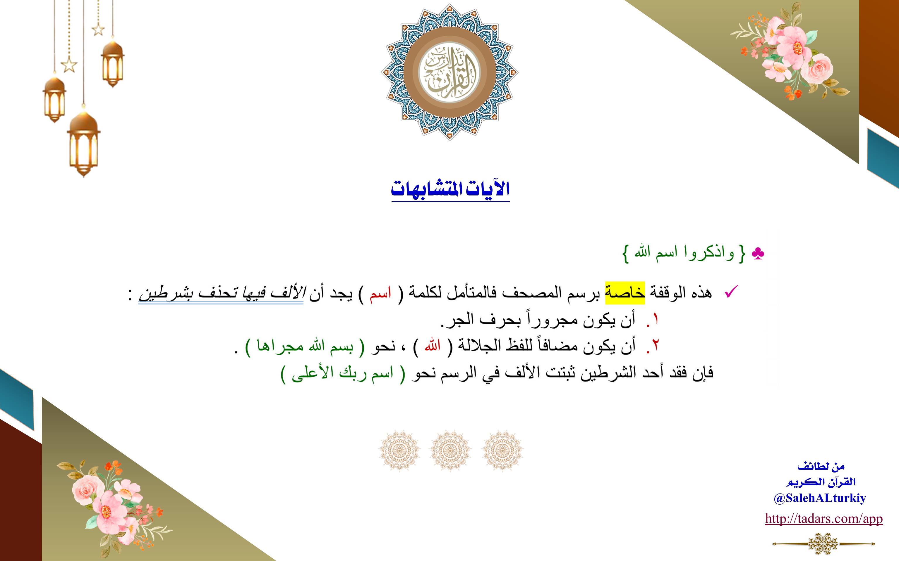 هذه الوقفة خاصة برسم المصحف فالمتأمل لكلمة (اسم) يجد أن الألف فيها تحذف بشرطين: