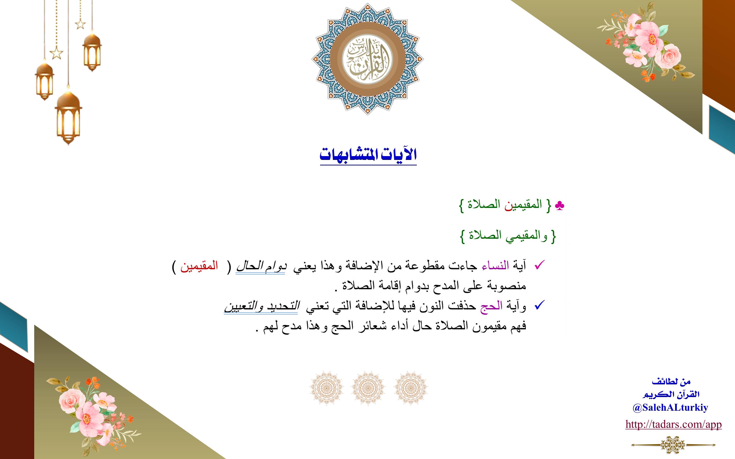 وآية (الحج) حذفت النون فيها للإضافة التي تعني التحديد والتعيين فهم مقيمون الصلاة حال أداء شعائر الحج وهذا مدح لهم.