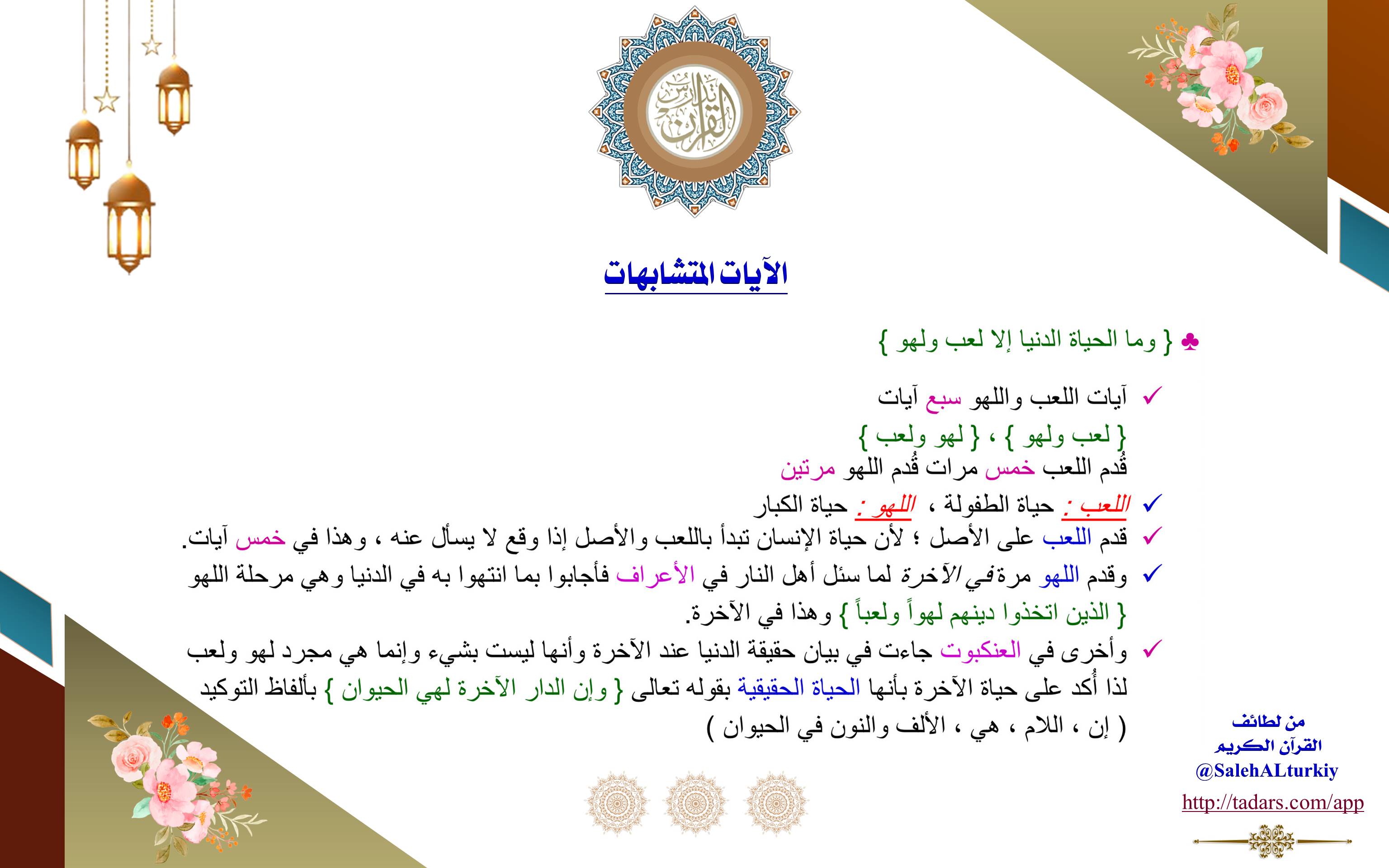 (اللعب): حياة الطفولة، (اللهو): حياة الكبار.