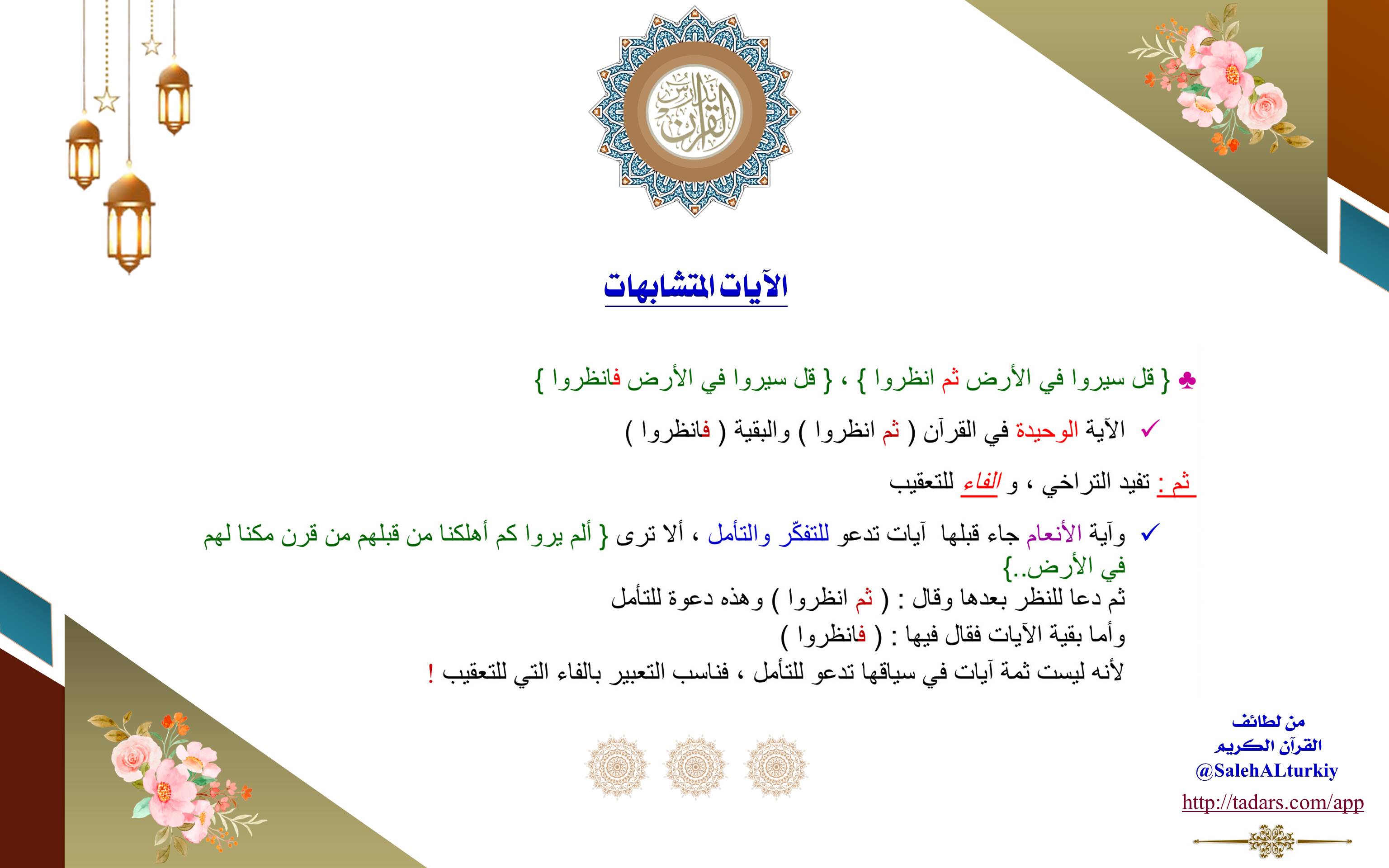 الآية الوحيدة في القرآن (ثُمَّ انظُرُوا) والبقية (فَانظُرُوا) ثم تفيد التراخي، والفاء للتعقيب. وآية الأنعام جاء قبلها آيات تدعو للتفكّر والتأمل، ألا ترى {أَلَمْ يَرَوْا كَمْ أَهْلَكْنَا مِن قَبْلِهِم مِّن قَرْنٍ مَّكَّنَّاهُمْ فِي الْأَرْضِ} ثم دعا للنظر بعدها وقال: (ثم انظروا) وهذه دعوة للتأمل، وأما بقية الآيات فقال فيها: (فانظروا) لأنه ليست ثمة آيات في سياقها تدعو للتأمل، فناسب التعبير بالفاء التي للتعقيب!