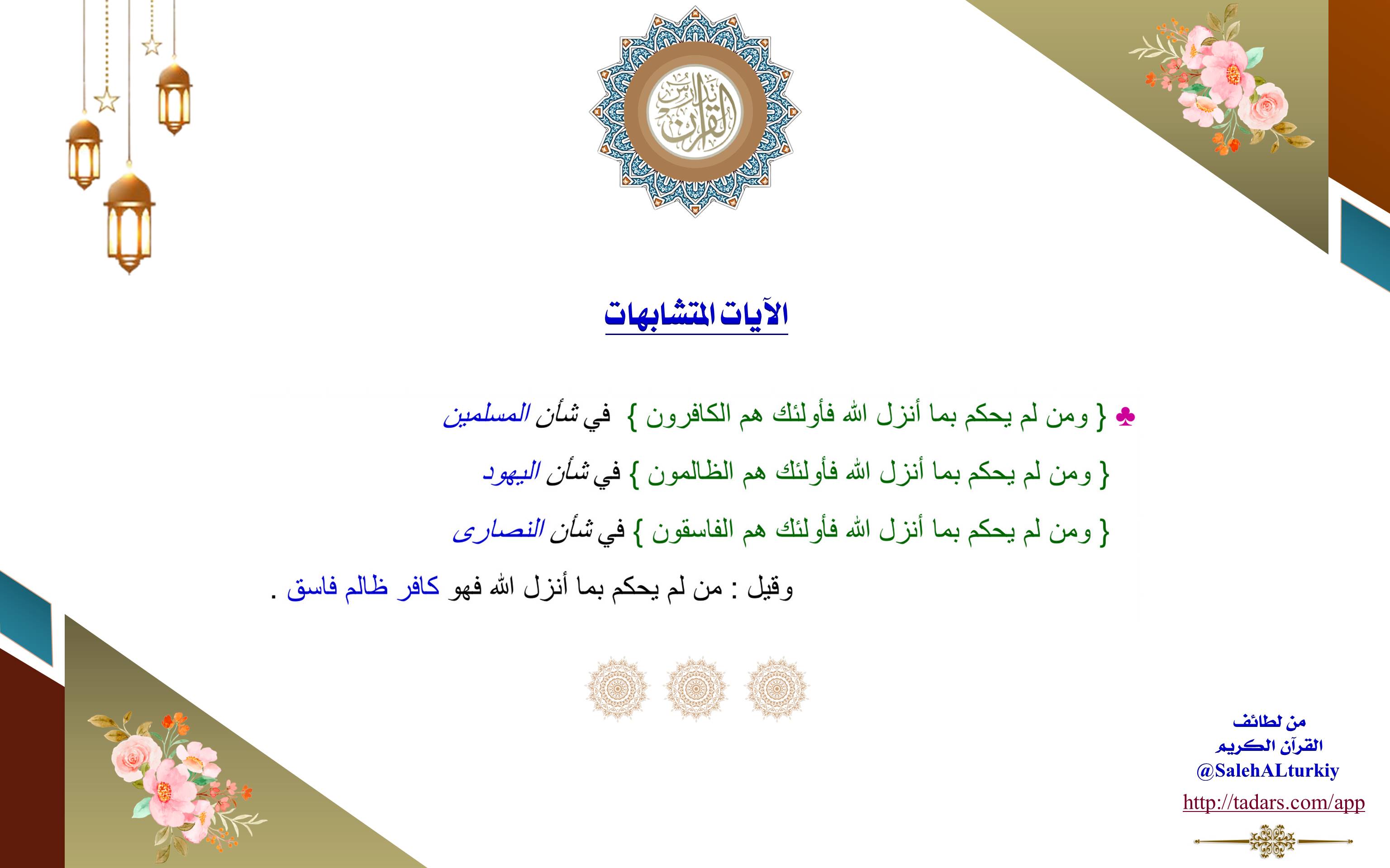 ﴿وَمَن لَّمْ يَحْكُم بِمَا أَنزَلَ اللَّهُ فَأُولَئِكَ هُمُ الْكَافِرُونَ﴾ في شأن (المسلمين).