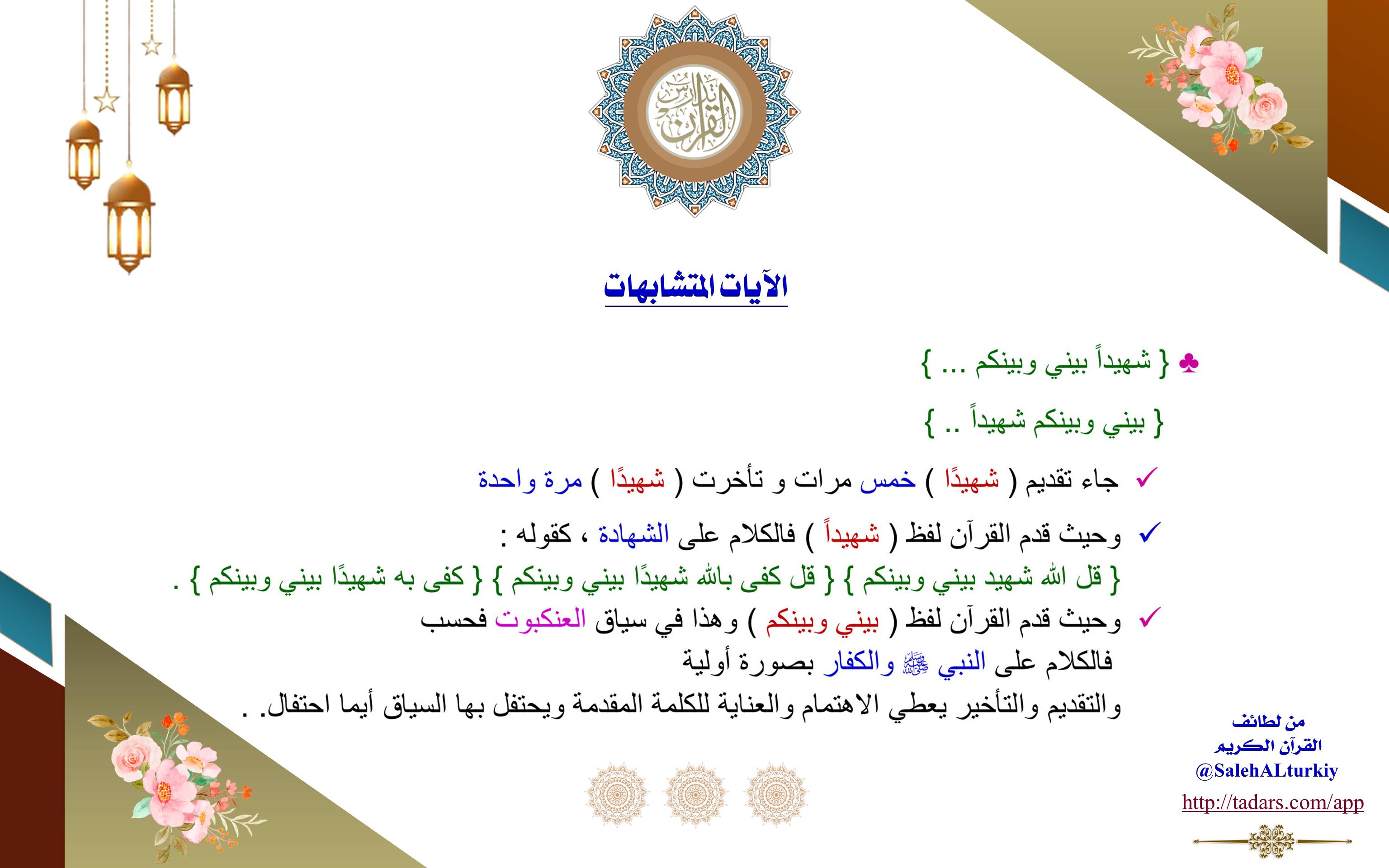 جاء تقديم (شهيدًا) خمس مرات، وتأخرت (شهيدًا) مرة واحدة. وحيث قدم القرآن لفظ (شهيداً) فالكلام على الشهادة، كقوله: {قُلِ اللَّهُ شَهِيدٌ بَيْنِي وَبَيْنَكُمْ} ، {قُلْ كَفَى بِاللَّهِ شَهِيدًا بَيْنِي وَبَيْنَكُمْ} ، {كَفَى بِهِ شَهِيدًا بَيْنِي وَبَيْنَكُمْ}. وحيث قدم القرآن لفظ (بيني وبينكم) وهذا في سياق العنكبوت فحسب فالكلام على النبي (ﷺ) والكفار بصورة أولية والتقديم والتأخير يعطي الاهتمام والعناية للكلمة المقدمة ويحتفل بها السياق أيما احتفال.