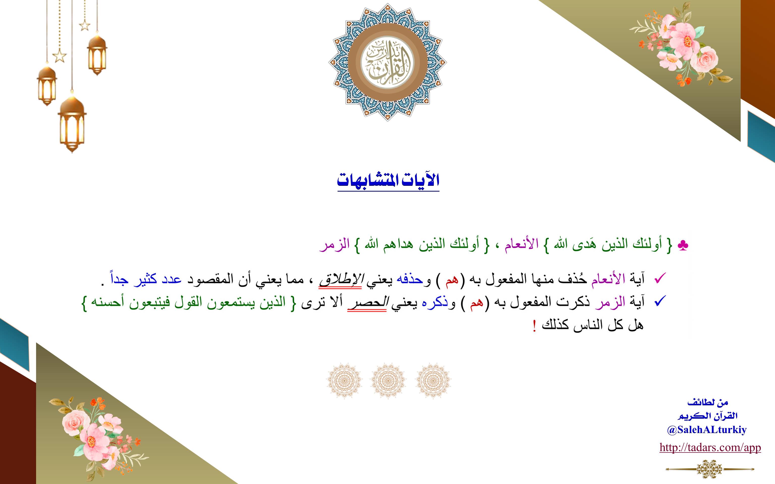 آية (الزمر): ذكرت المفعول به (هم) وذكره يعني الحصر؛ ألا ترى: (الَّذِينَ يَسْتَمِعُونَ الْقَوْلَ فَيَتَّبِعُونَ أَحْسَنَهُ) هل كل الناس كذلك!