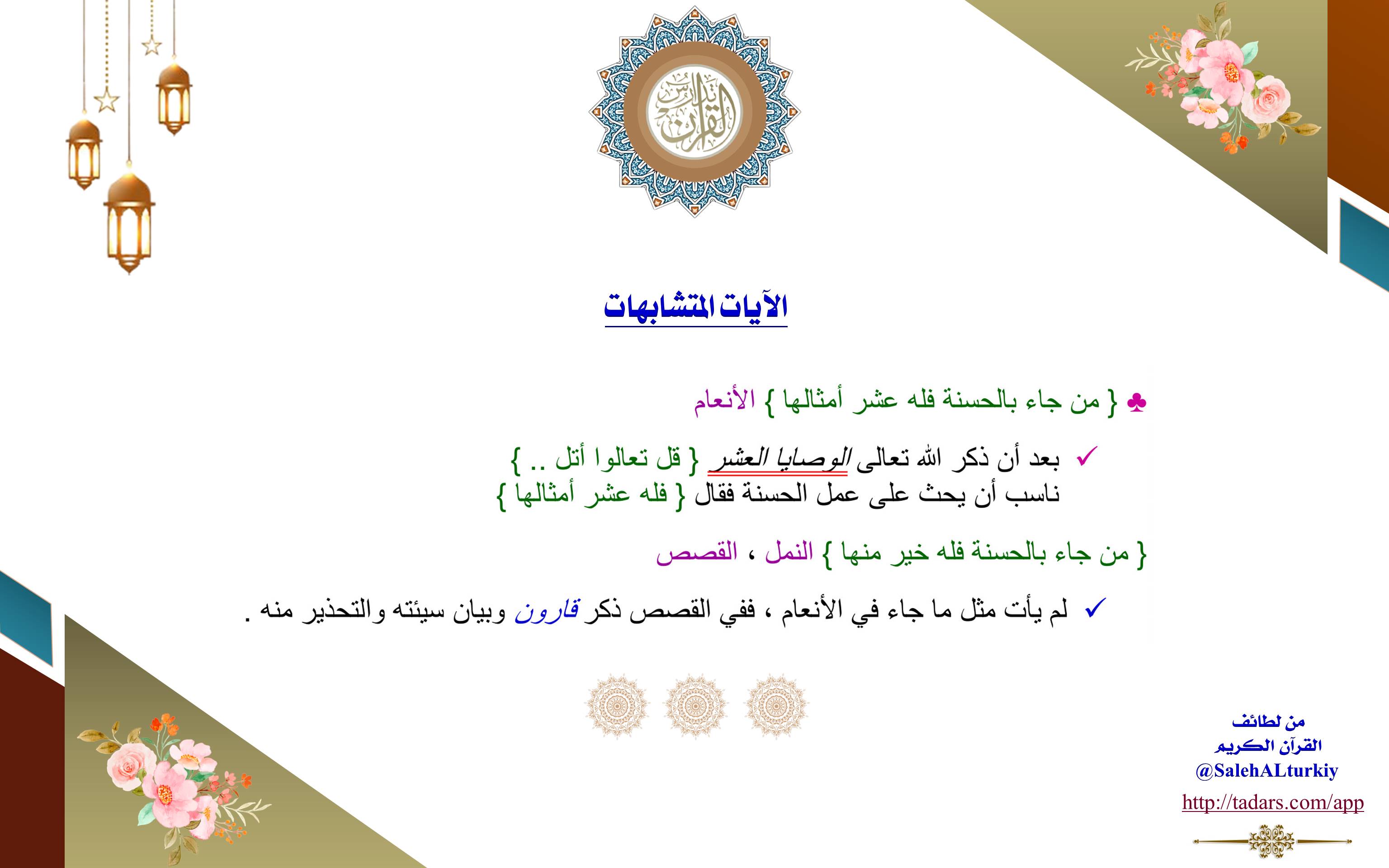 بعد أن ذكر الله تعالى الوصايا العشر (قُلْ تَعَالَوْا أَتْلُ) ناسب أن يحث على عمل الحسنة فقال: (فَلَهُ عَشْرُ أَمْثَالِهَا).