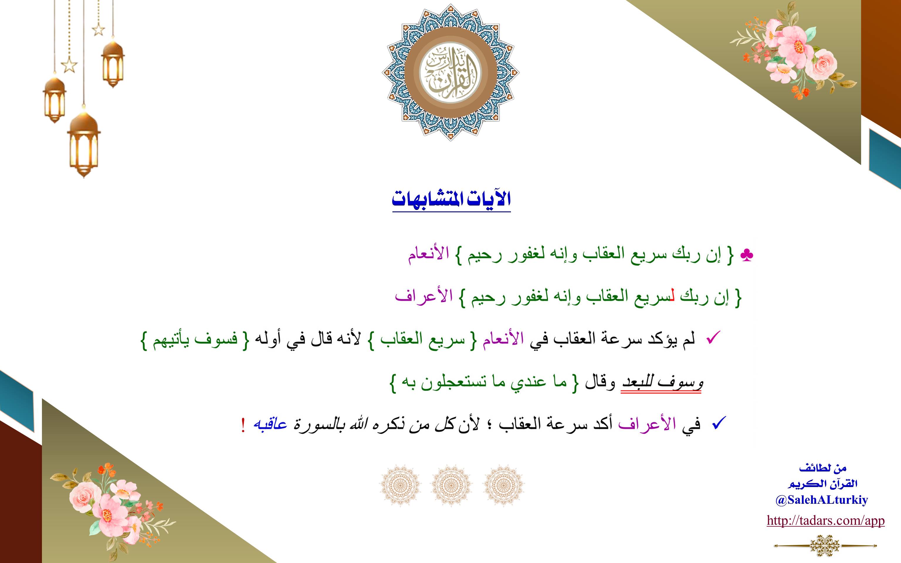 لم يؤكد سرعة العقاب في الأنعام (سَرِيعُ الْعِقَابِ) لأنه قال في أوله (فسوف يأتيهم) وسوف للبعد وقال (مَا عِندِي مَا تَسْتَعْجِلُونَ بِهِ)، في الأعراف أكد سرعة العقاب؛ لأن كل من ذكره الله بالسورة عاقبه!.