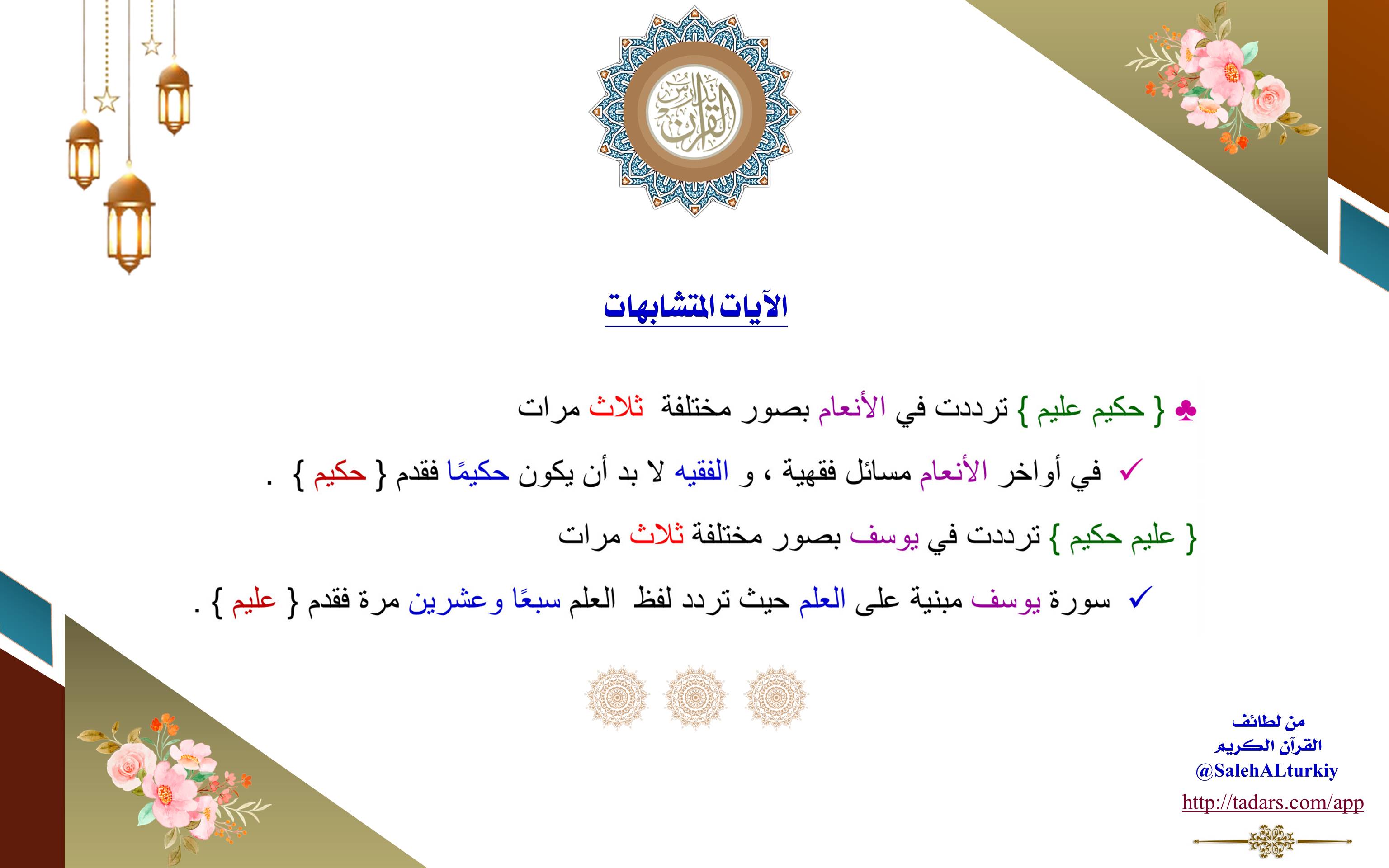 ترددت في الأنعام بصور مختلفة ثلاث مرات في أواخر الأنعام مسائل فقهية، والفقيه لا بد أن يكون حكيمًا فقدم (حكيم).