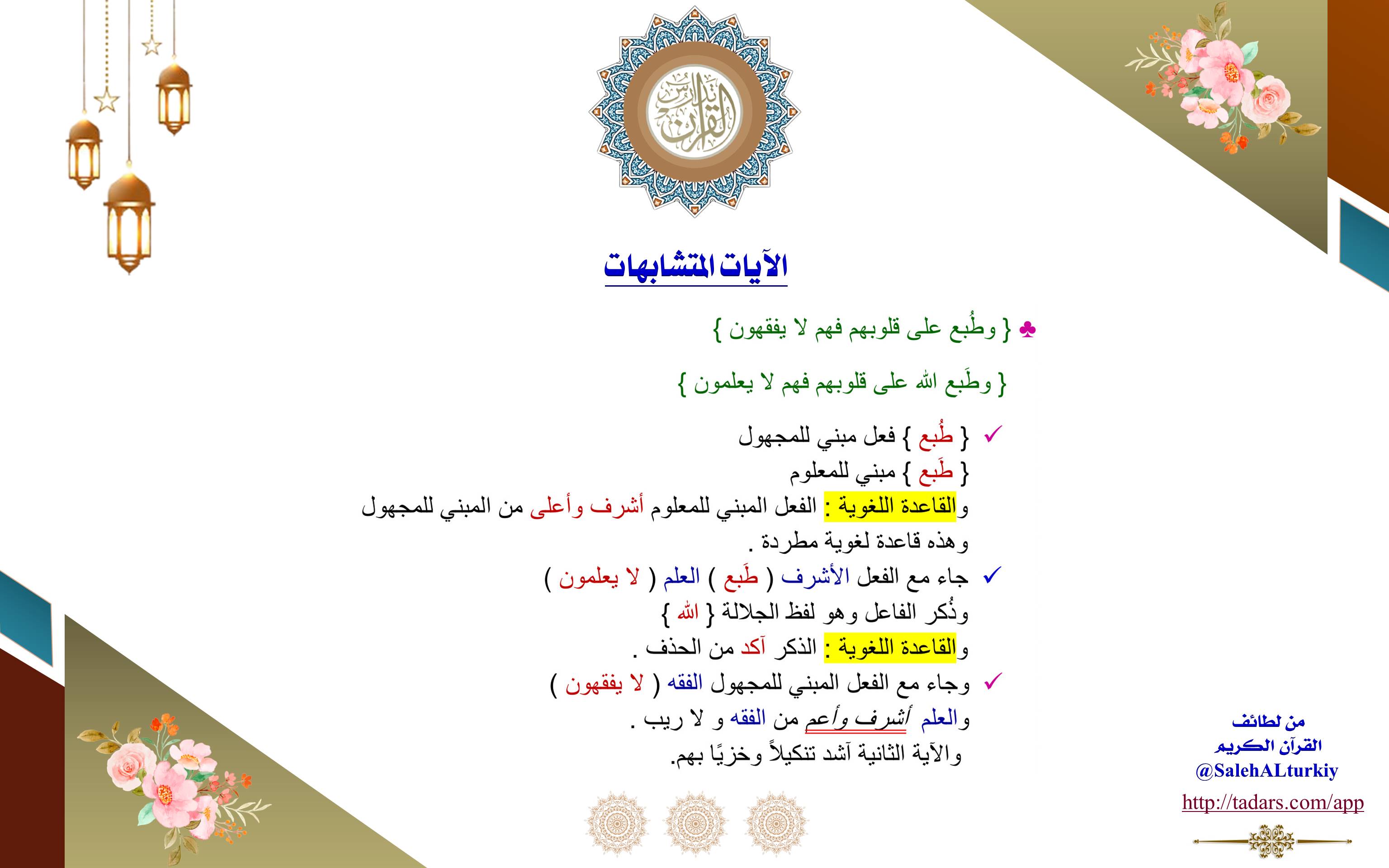 وجاء مع الفعل المبني للمجهول الفقه (لا يفقهون) والعلم أشرف وأعم من الفقه ولا ريب. والآية الثانية آشد تنكيلاً وخزيًا بهم.