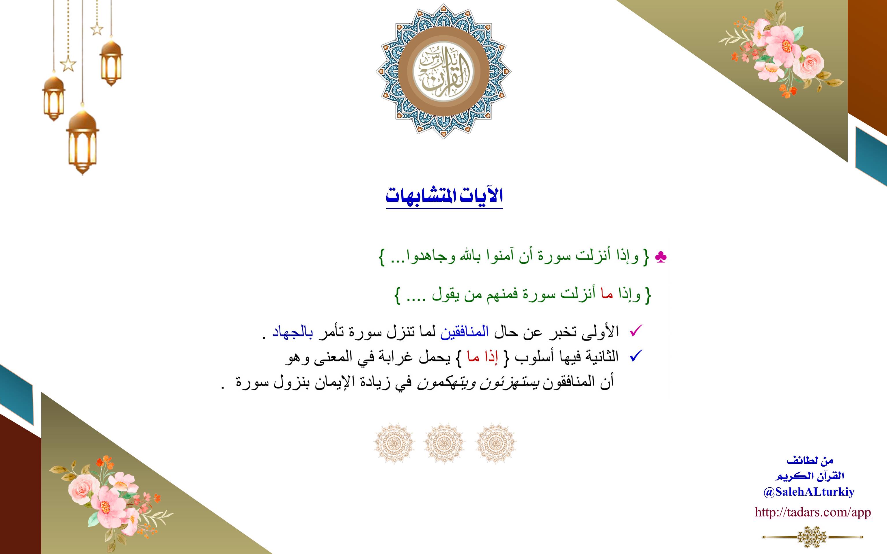 (الثانية): فيها أسلوب (إذا ما) يحمل غرابة في المعنى وهو أن المنافقون يستهزئون ويتهكمون في زيادة الإيمان بنزول سورة.