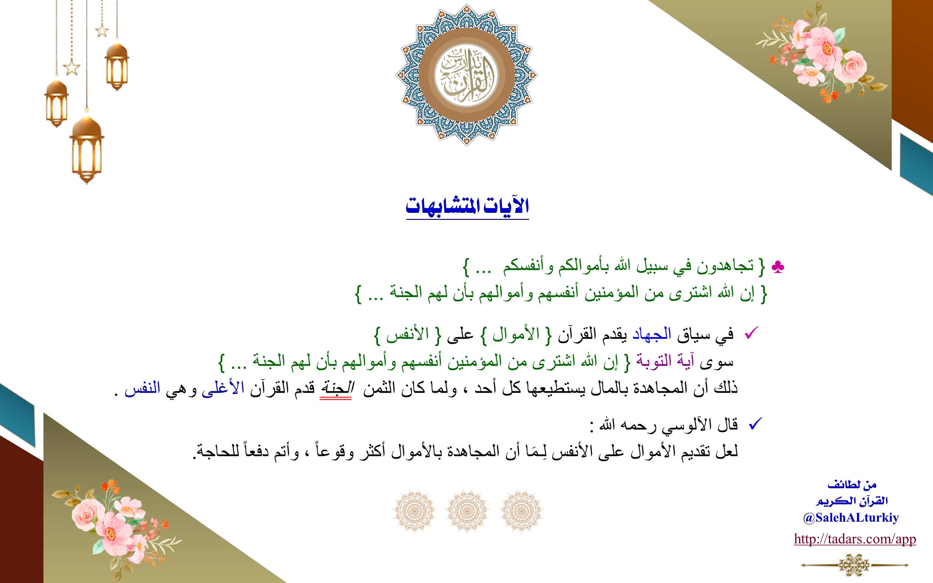 في سياق الجهاد يقدم القرآن (الأموال) على (الأنفس) سوى آية التوبة: (إِنَّ اللَّهَ اشْتَرَى مِنَ الْمُؤْمِنِينَ أَنفُسَهُمْ وَأَمْوَالَهُم بِأَنَّ لَهُمُ الْجَنَّةَ..) ذلك أن المجاهدة بالمال يستطيعها كل أحد، ولما كان الثمن الجنة قدم القرآن الأغلى وهي النفس.