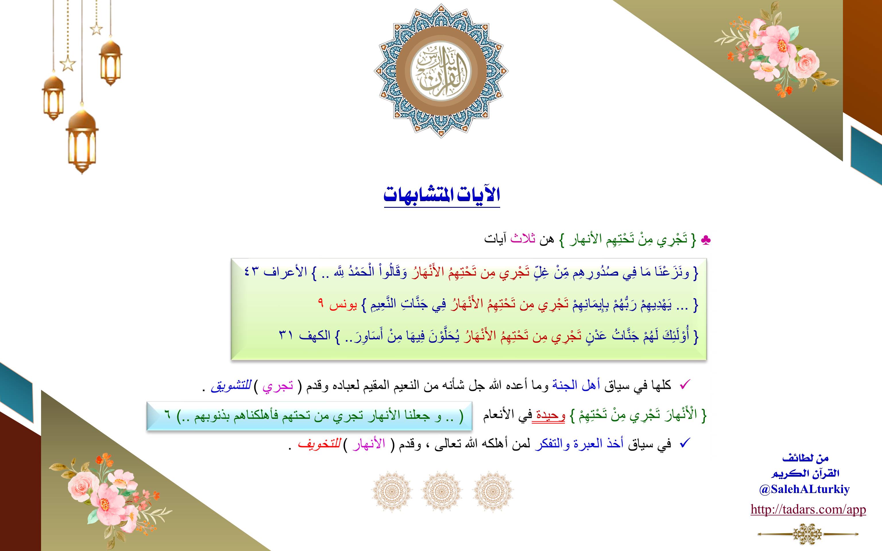 (تَجْرِي مِن تَحْتِهِمُ الْأَنْهَارُ) هن ثلاث آيات؛ كلها في سياق أهل الجنة وما أعده الله جل شأنه من النعيم المقيم لعباده وقدم (تجري) للتشويق.
