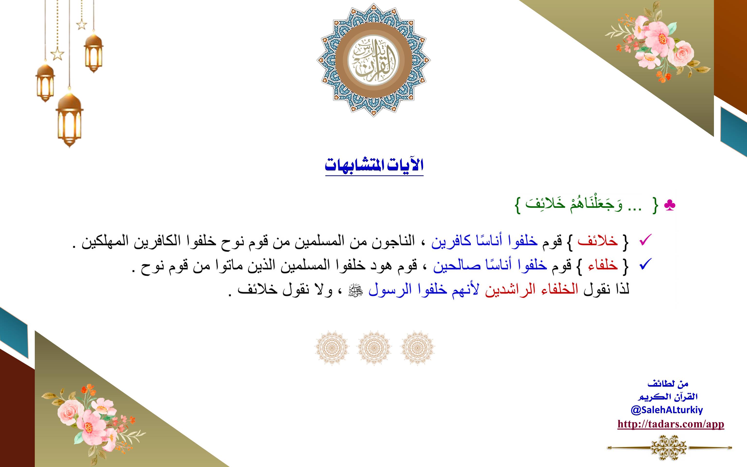 { خلائف}: قوم خلفوا أناسًا كافرين، الناجون من المسلمين من قوم نوح خلفوا الكافرين المهلكين.