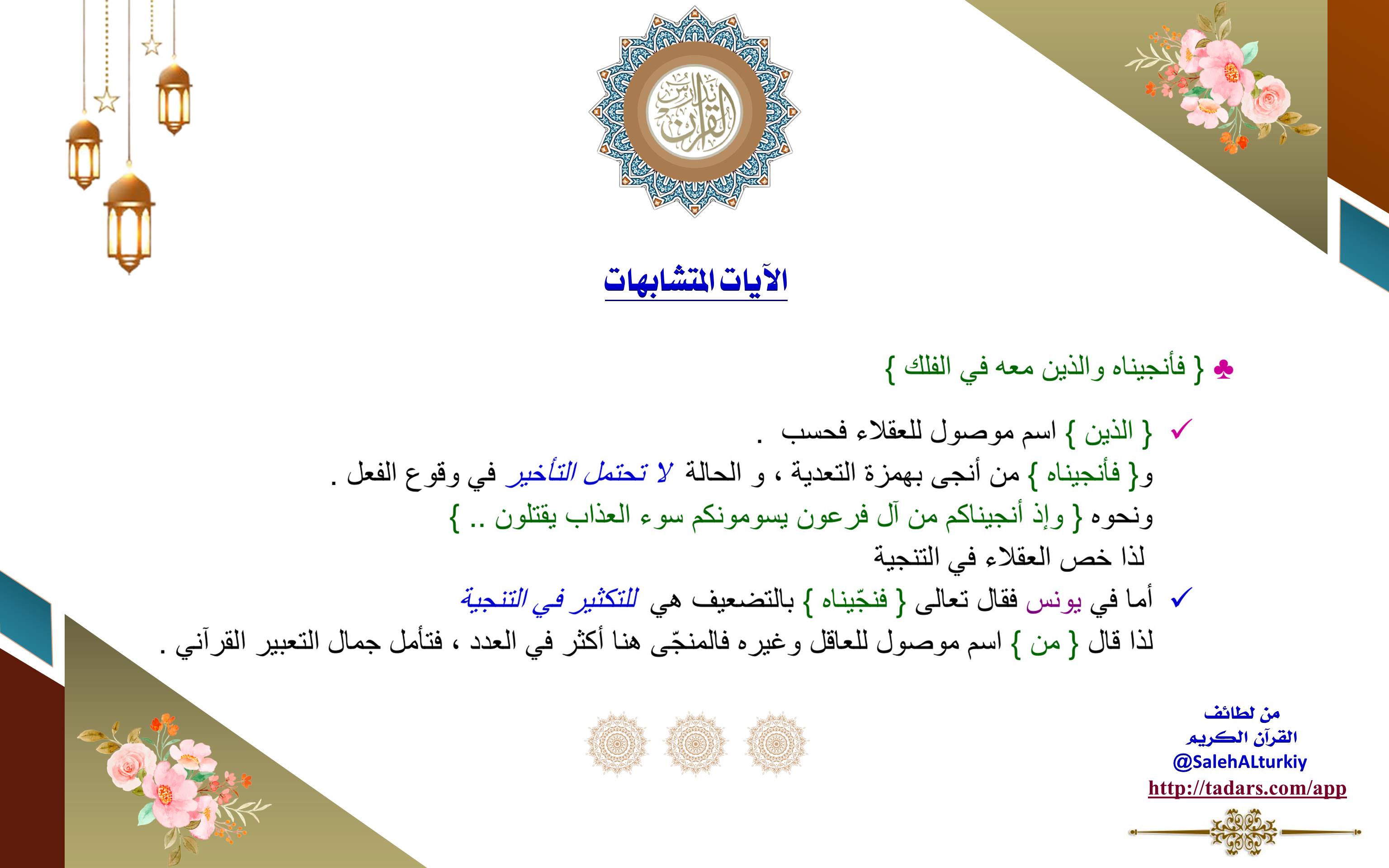 أما في (يونس) فقال تعالى: {فَنَجَّيْنَاهُ} بالتضعيف هي للتكثير في التنجية لذا قال {من} اسم موصول للعاقل وغيره فالمنجّي هنا أكثر في العدد، فتأمل جمال التعبير القرآني.