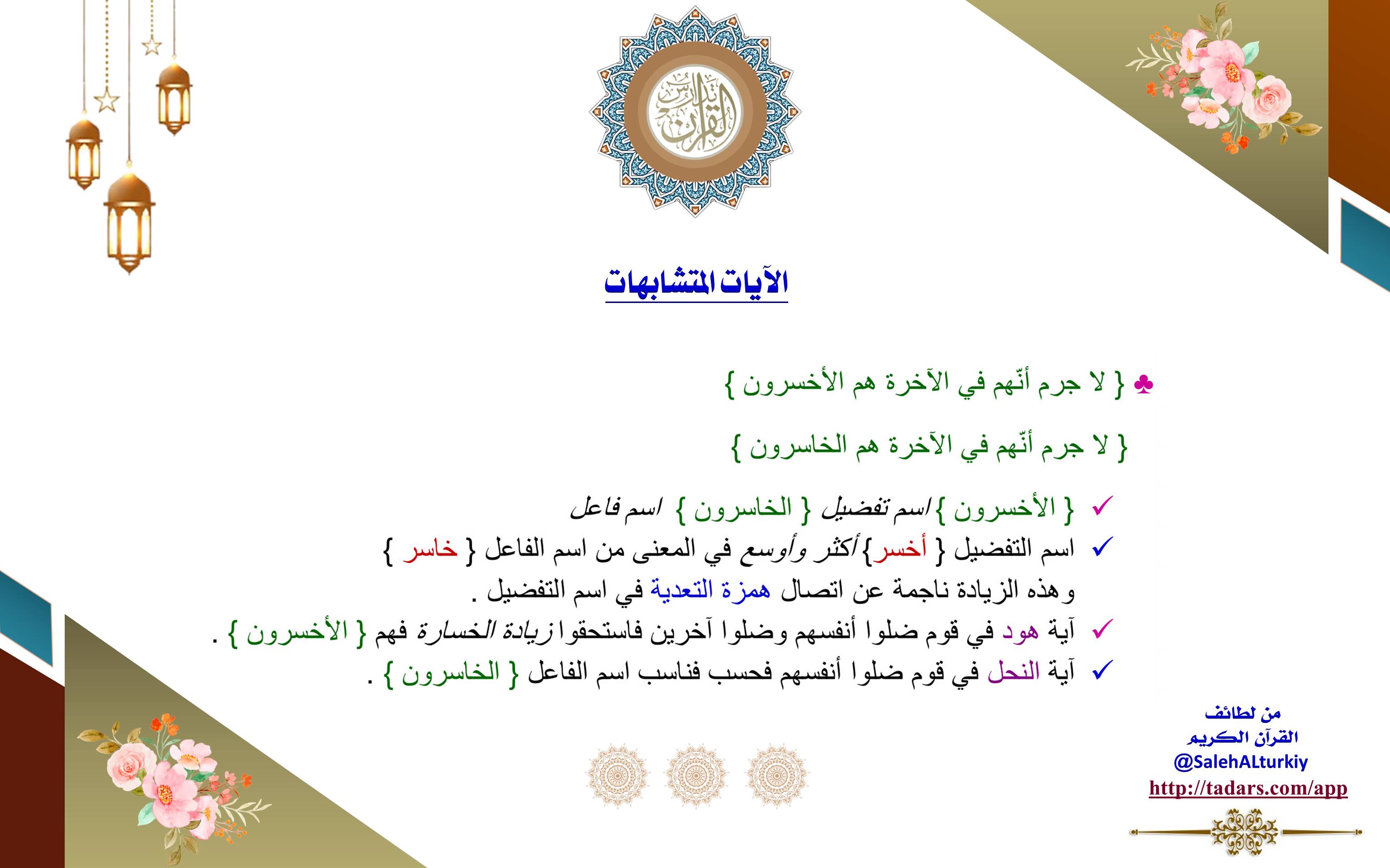 آية النحل: في قوم ضلوا أنفسهم فحسب فناسب اسم الفاعل {الخاسرون}.