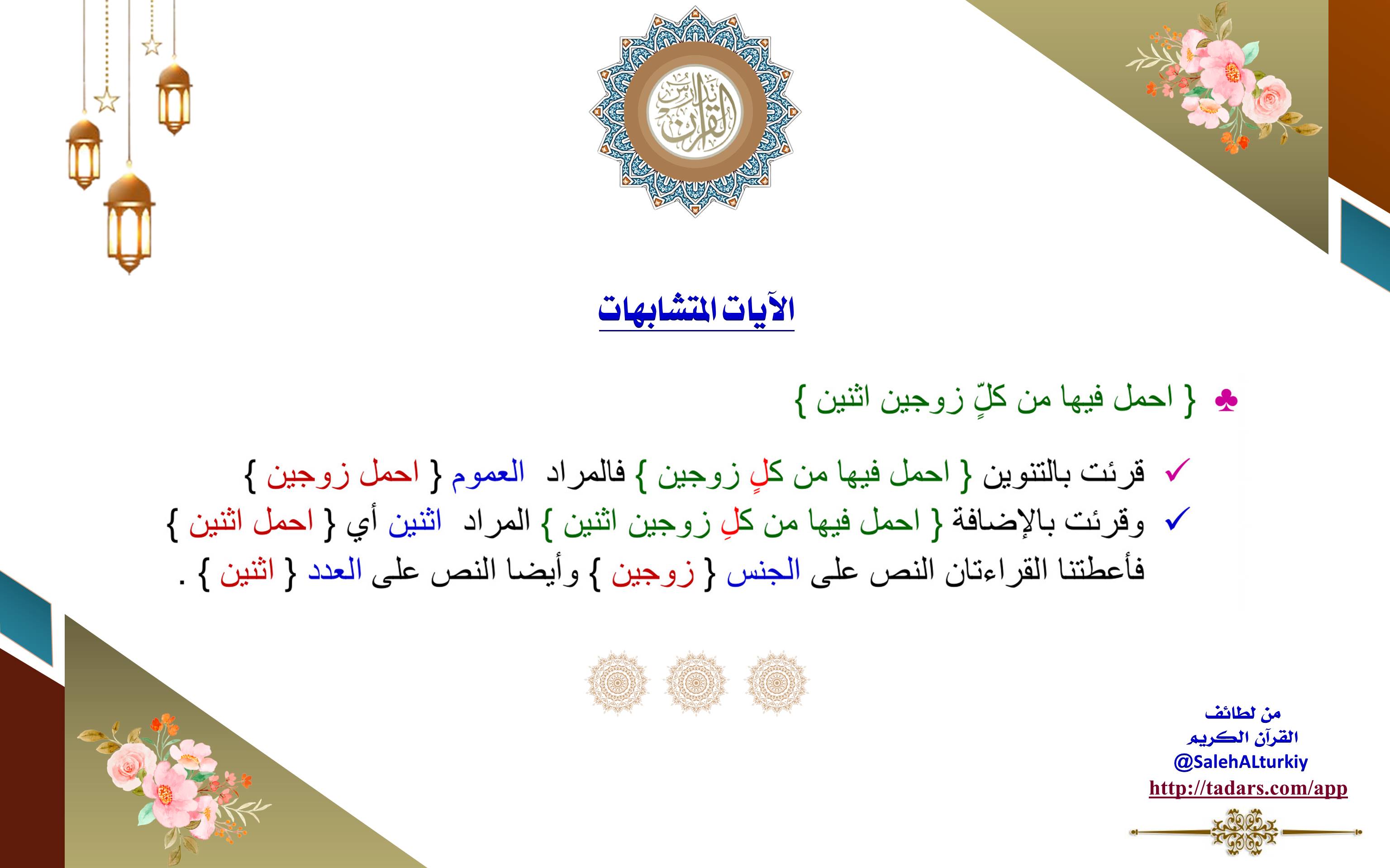 وقرئت بالإضافة { احمل فيها من كلِ زوجين اثنين} المراد اثنين أي {احمل اثنين}.