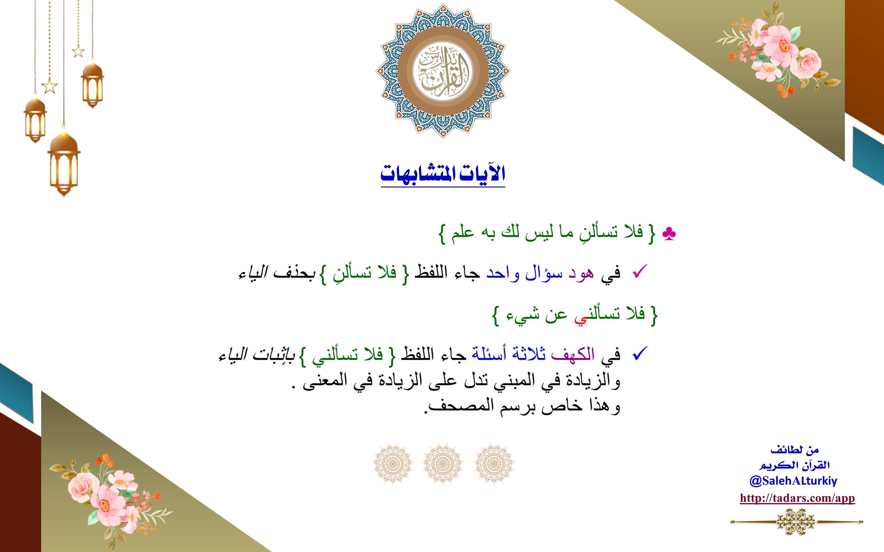 في (الكهف) ثلاثة أسئلة جاء اللفظ {فلا تسألني} بإثبات الياء، والزيادة في المبني تدل على الزيادة في المعنى. وهذا خاص برسم المصحف.