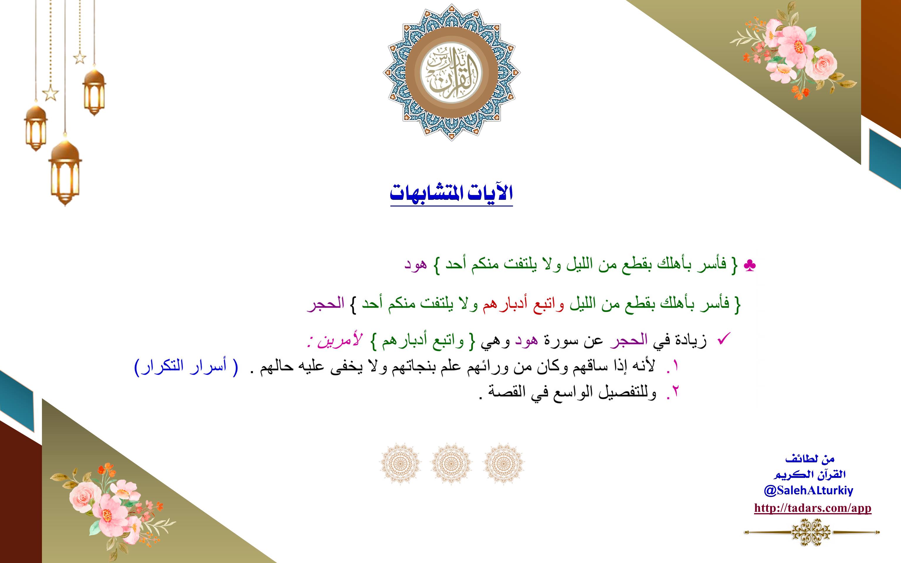 زيادة في (الحجر) عن سورة (هود) وهي {واتبع أدبارهم} لأمرين: