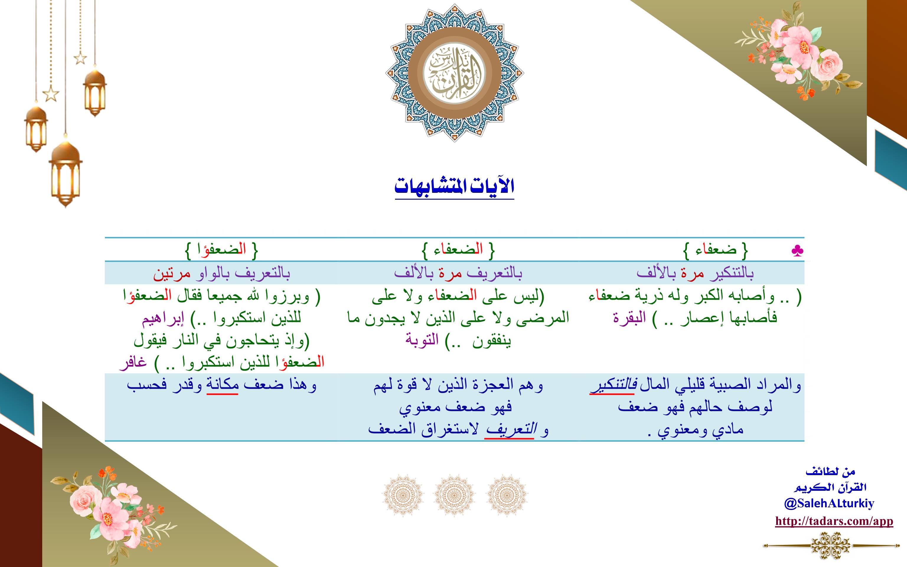 بالتعريف مرة بالألف: (لَّيْسَ عَلَى الضُّعَفَاءِ وَلَا عَلَى الْمَرْضَى وَلَا عَلَى الَّذِينَ لَا يَجِدُونَ مَا يُنفِقُونَ) التوبة.