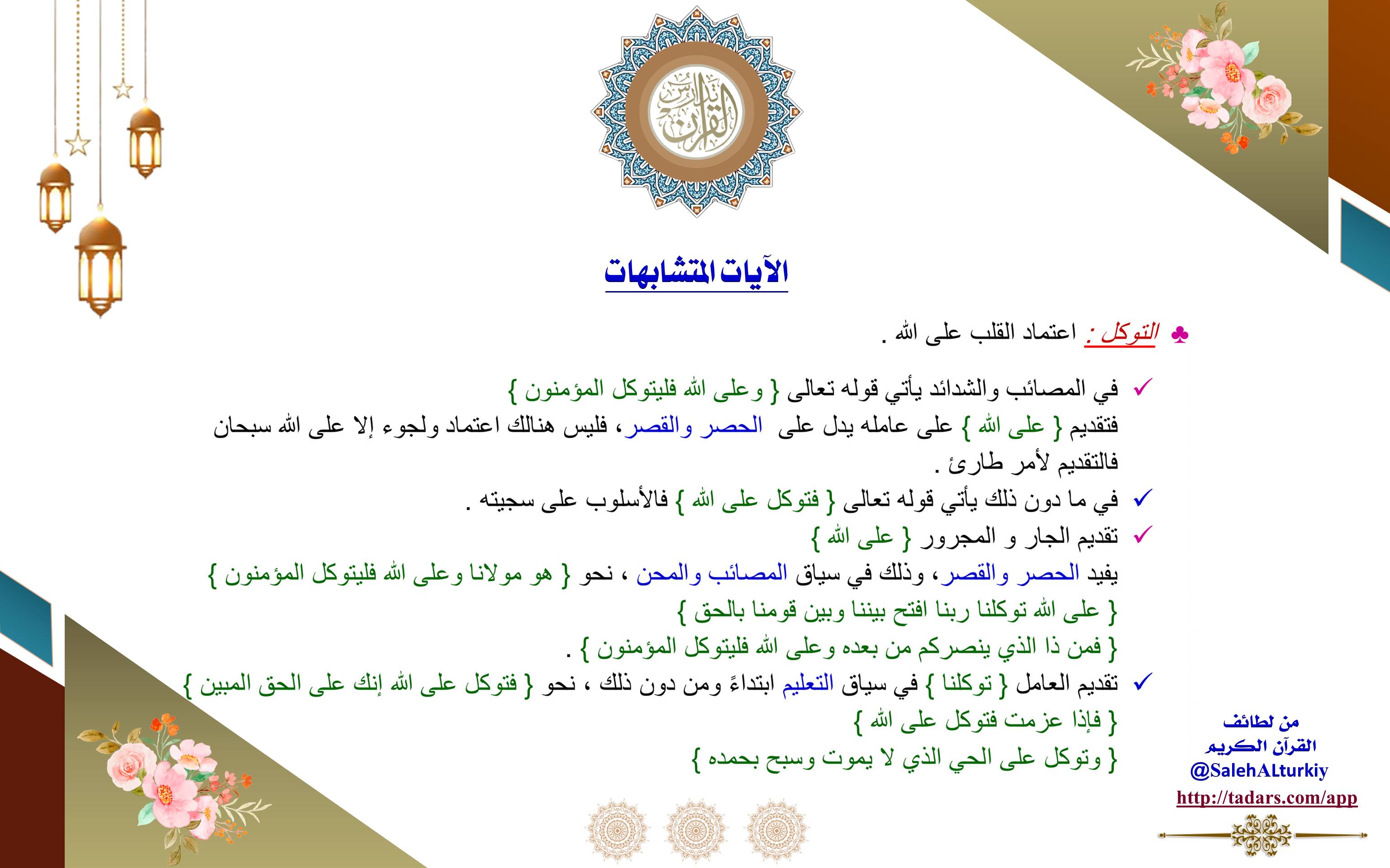 في المصائب والشدائد يأتي قوله تعالى: {وَعَلَى اللَّهِ فَلْيَتَوَكَّلِ الْمُؤْمِنُونَ} فتقديم (على الله) على عامله يدل على الحصر والقصر، فليس هنالك اعتماد ولجوء إلا على الله سبحانه فالتقديم لأمر طارئ.