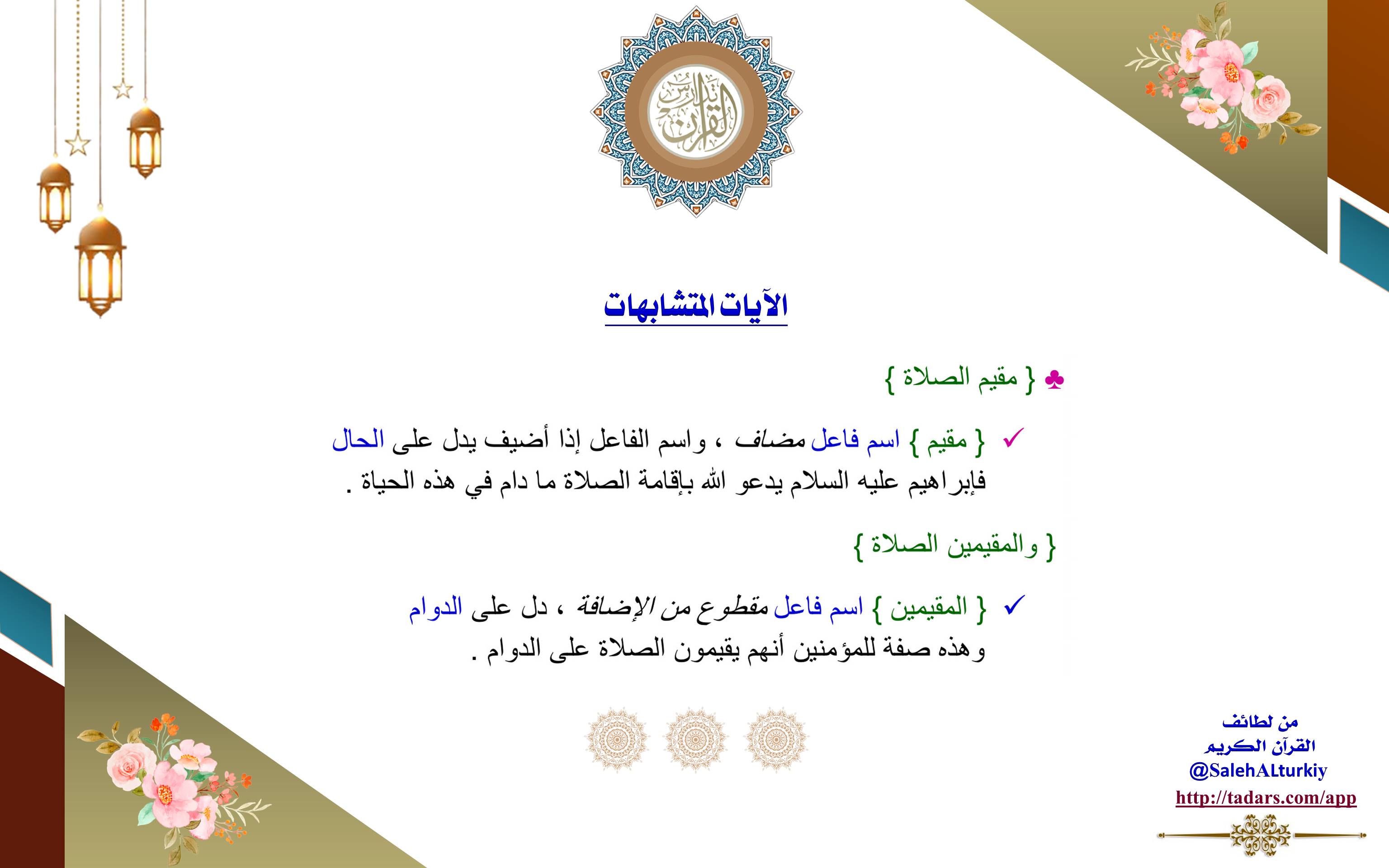 {المقيمين} اسم فاعل مقطوع من الإضافة، دل على الدوام وهذه صفة للمؤمنين أنهم يقيمون الصلاة على الدوام.