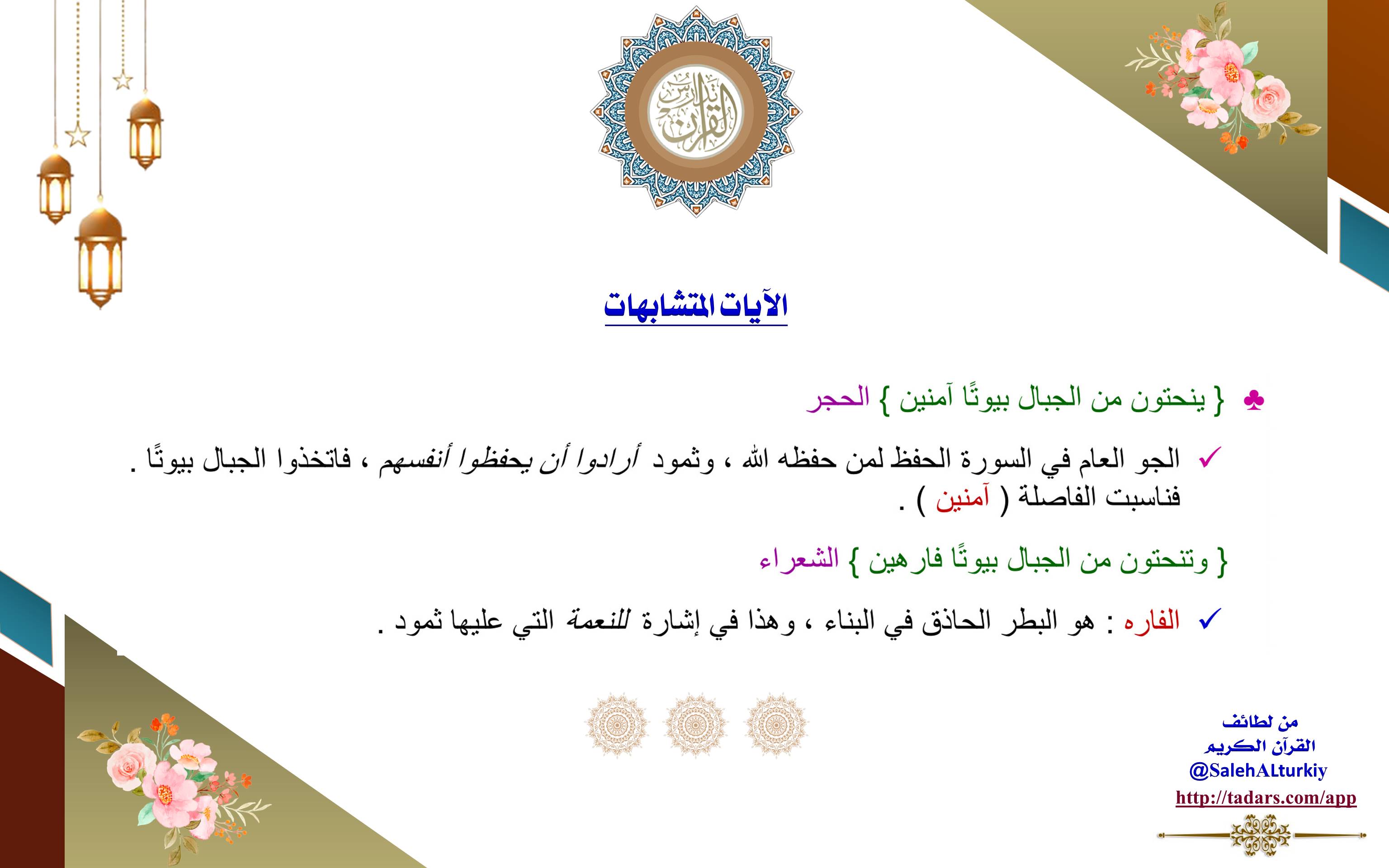 الجو العام في السورة الحفظ لمن حفظه الله، وثمود أرادوا أن يحفظوا أنفسهم، فاتخذوا الجبال بيوتًا؛ فناسبت الفاصلة (آمنين).