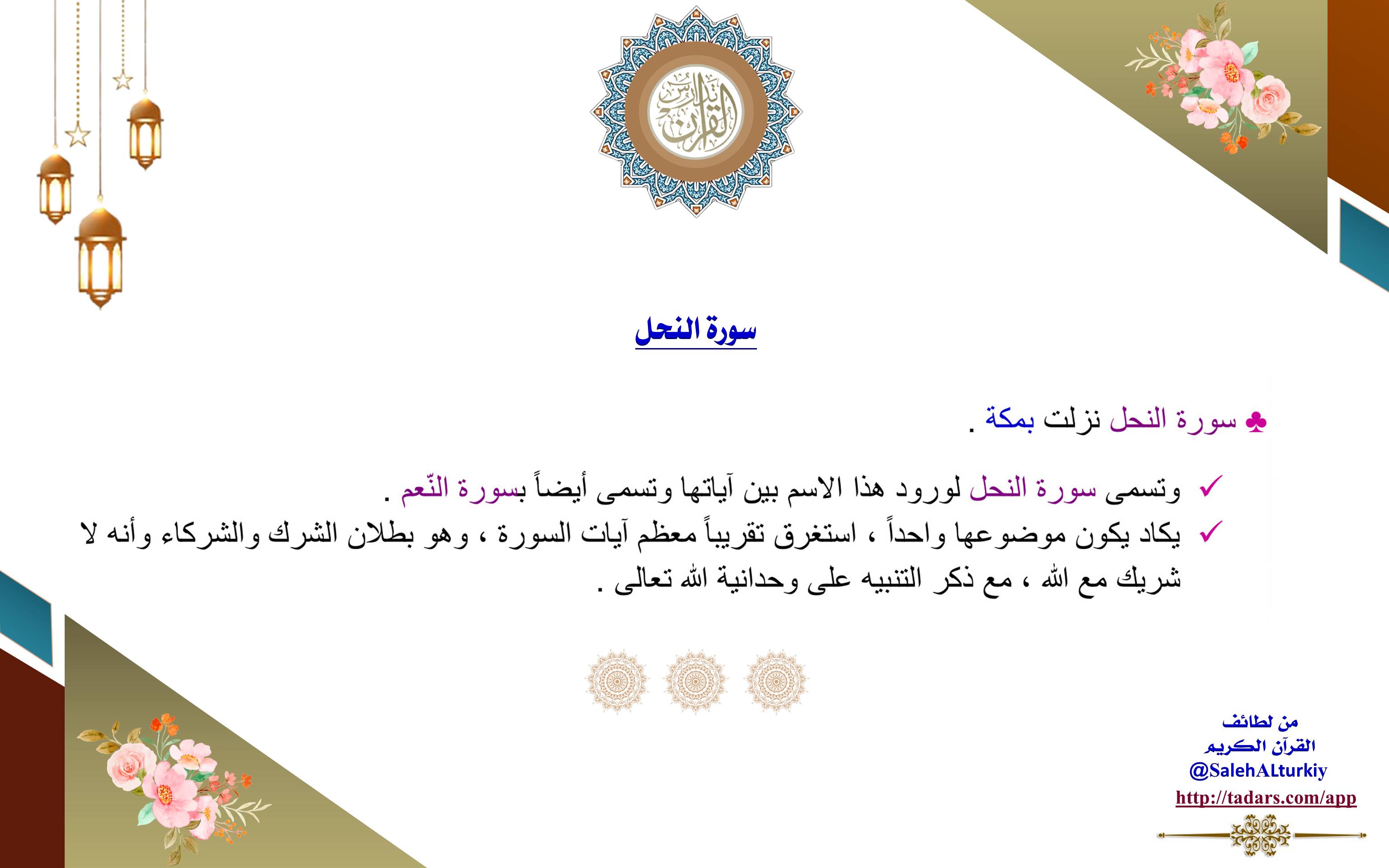 وتسمى سورة النحل لورود هذا الاسم بين آياتها وتسمى أيضاً بسورة النّعم.