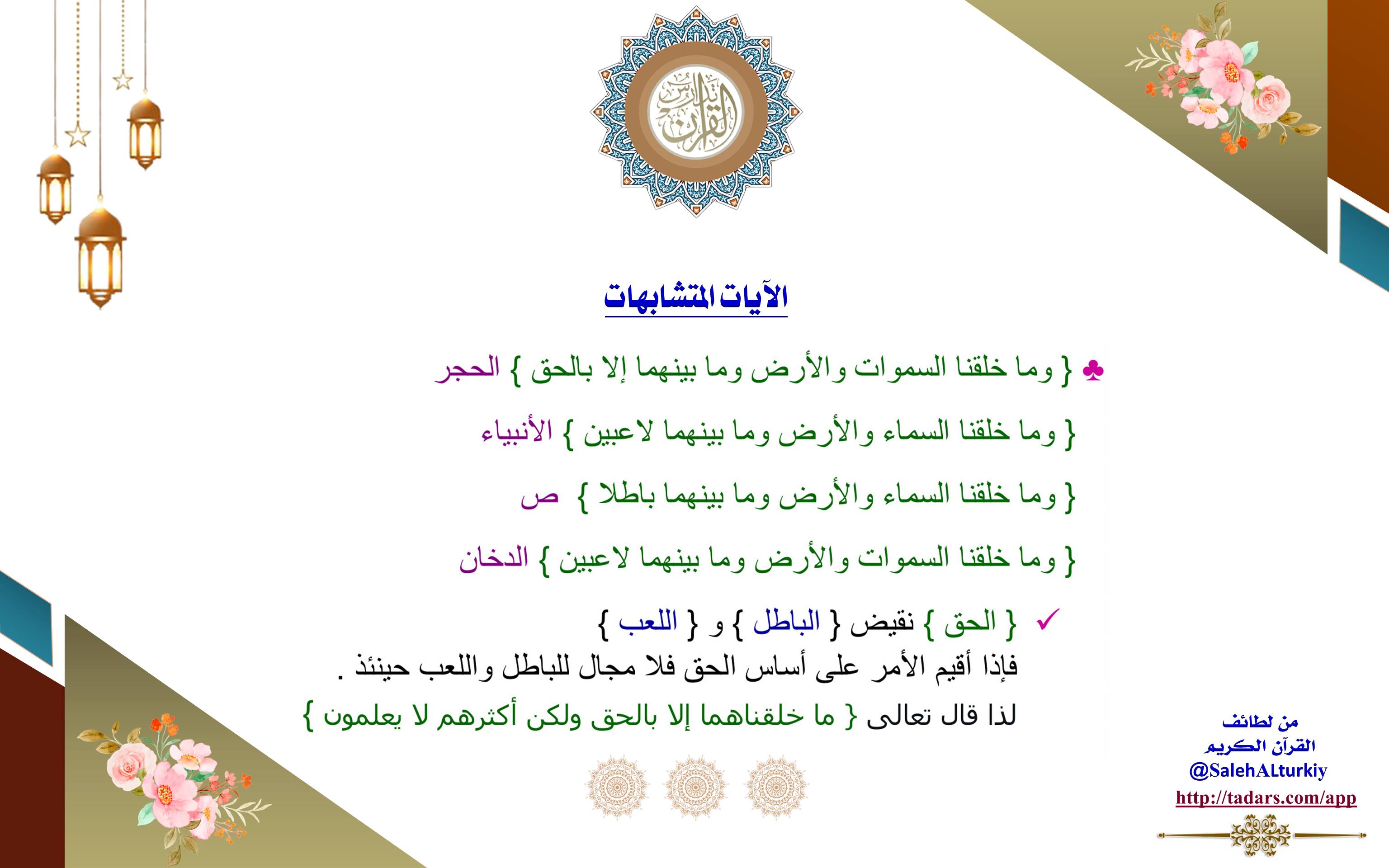 (الحق) نقيض (الباطل) و(اللعب) فإذا أقيم الأمر على أساس الحق فلا مجال للباطل واللعب حينئذ. لذا قال تعالي: (مَا خَلَقْنَاهُمَا إِلَّا بِالْحَقِّ وَلَكِنَّ أَكْثَرَهُمْ لَا يَعْلَمُونَ).