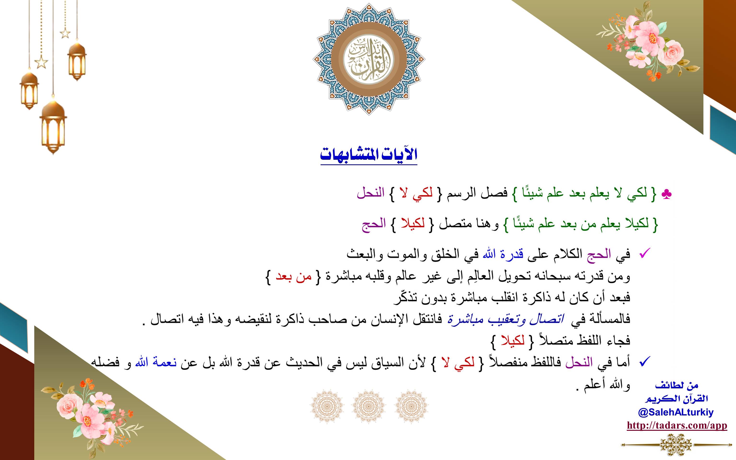 ﴿لِكَيْلَا يَعْلَمَ مِن بَعْدِ عِلْمٍ شَيْئًا﴾ وهنا متصل {لكيلا} الحج