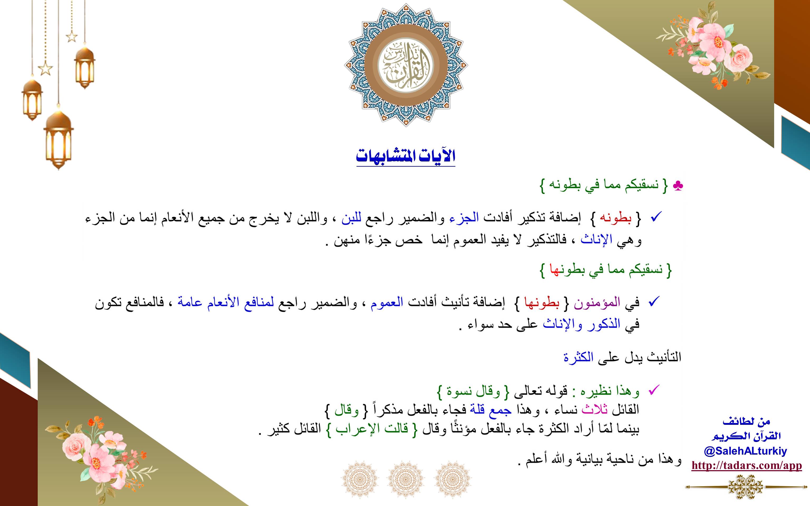 في المؤمنون {بطونها} إضافة تأنيث أفادت العموم، والضمير راجع لمنافع الأنعام عامة، فالمنافع تكون في الذكور والإناث على حد سواء.
