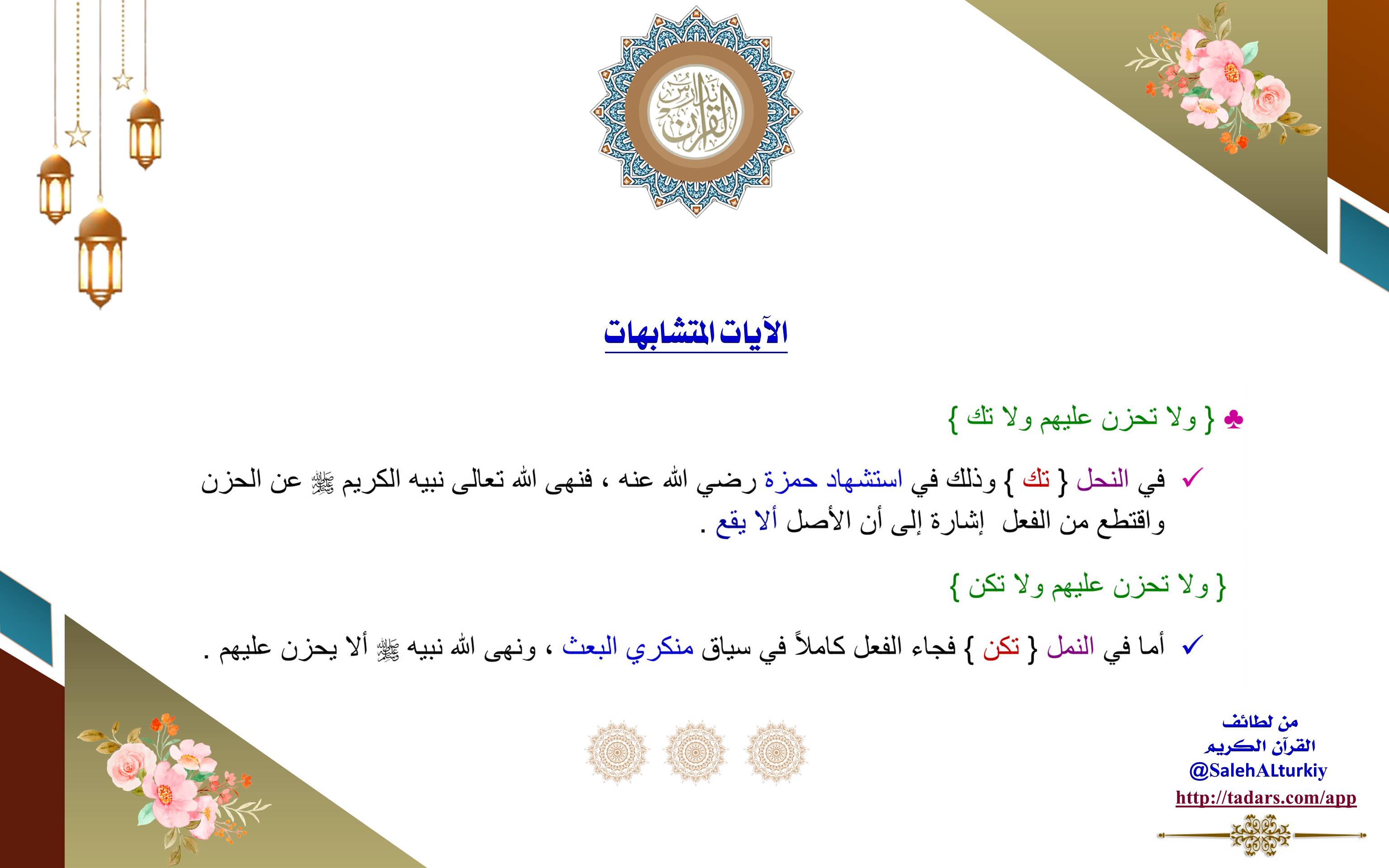 في النحل {تك} وذلك في استشهاد حمزة رضي الله، فنهى الله تعالى نبيه الكريم (ﷺ) عن الحزن واقتطع من الفعل إشارة إلى أن الأصل ألا يقع.