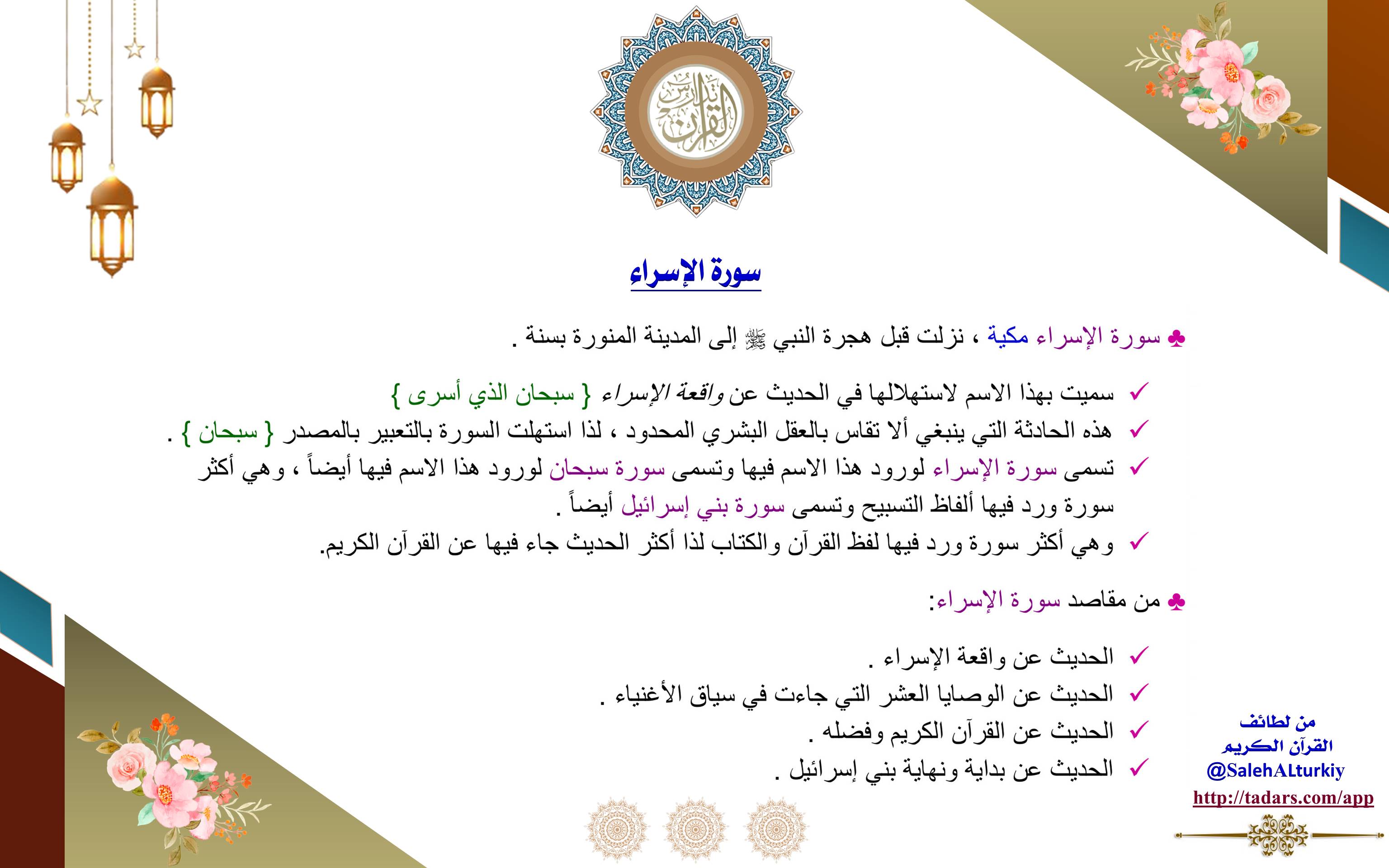 • سورة الإسراء مكية، نزلت قبل هجرة النبي (ﷺ) إلى المدينة المنورة بسنة.