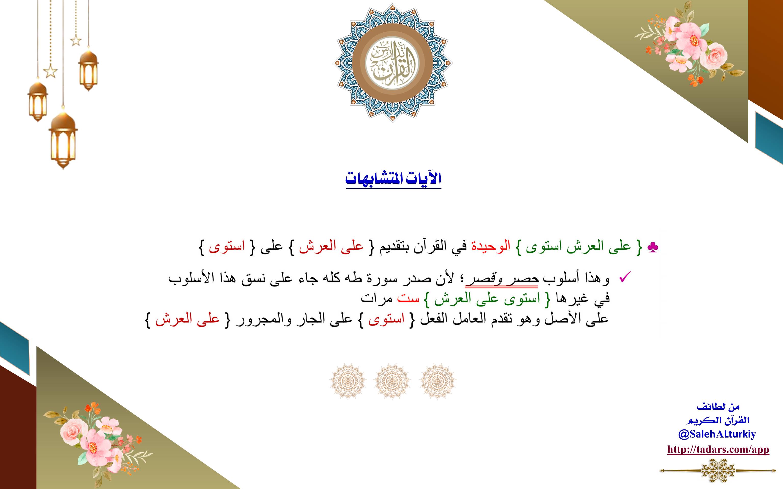 الوحيدة في القرآن بتقديم {على العرش} على { استوى } وهذا أسلوب حصر وقصر؛ لأن صدر سورة طه كله جاء على نسق هذا الأسلوب.