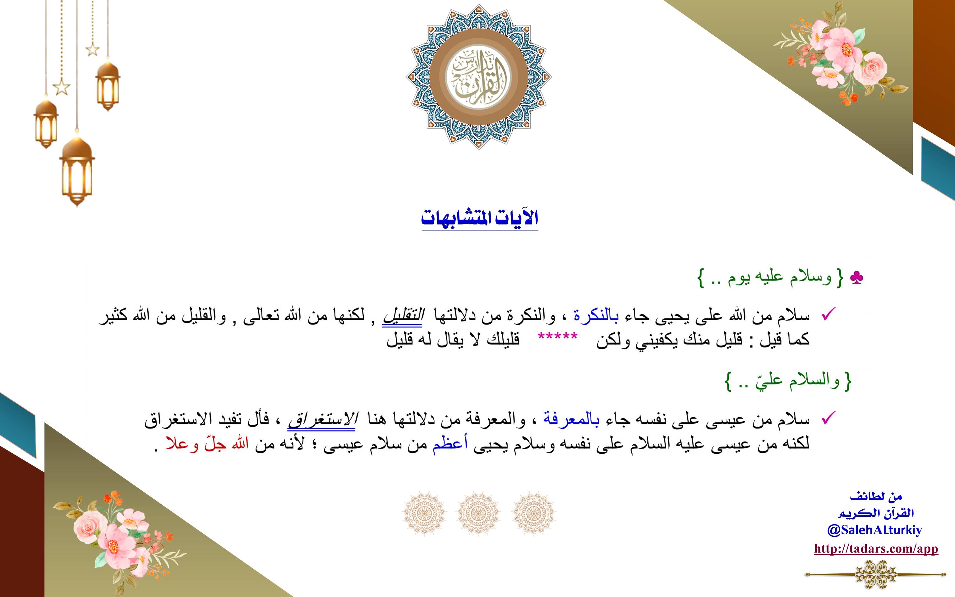 سلام من عيسى على نفسه جاء بالمعرفة، والمعرفة من دلالتها هنا الاستغراق، فأل تفيد الاستغراق، لكنه من عيسى عليه السلام على نفسه، وسلام يحيى أعظم من سلام عيسى؛ لأنه من الله جلّ وعلا.