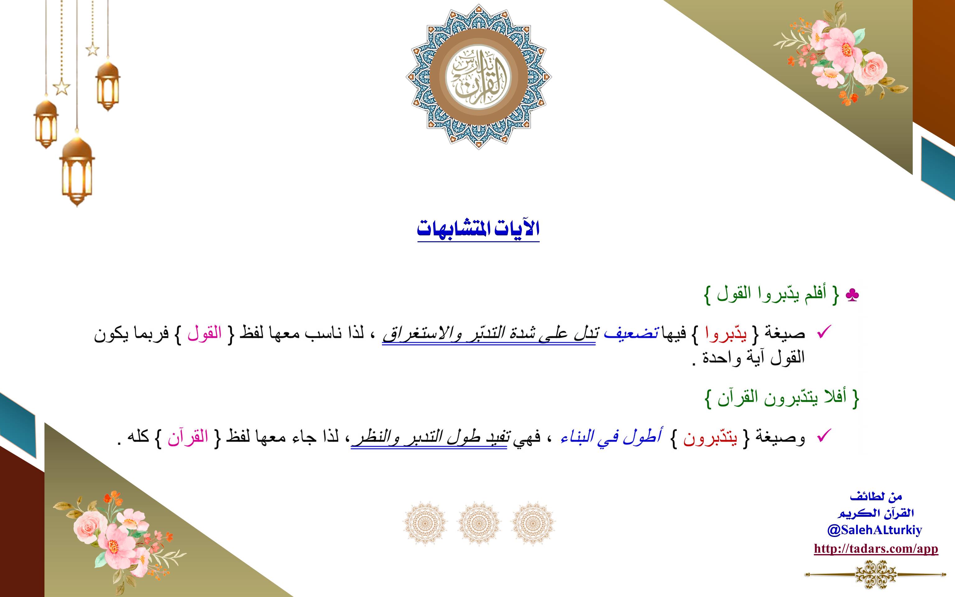 وصيغة {يتدبّرون} أطول في البناء، فهي تفيد طول التدبر والنظر، لذا جاء معها لفظ {القرآن} كله.
