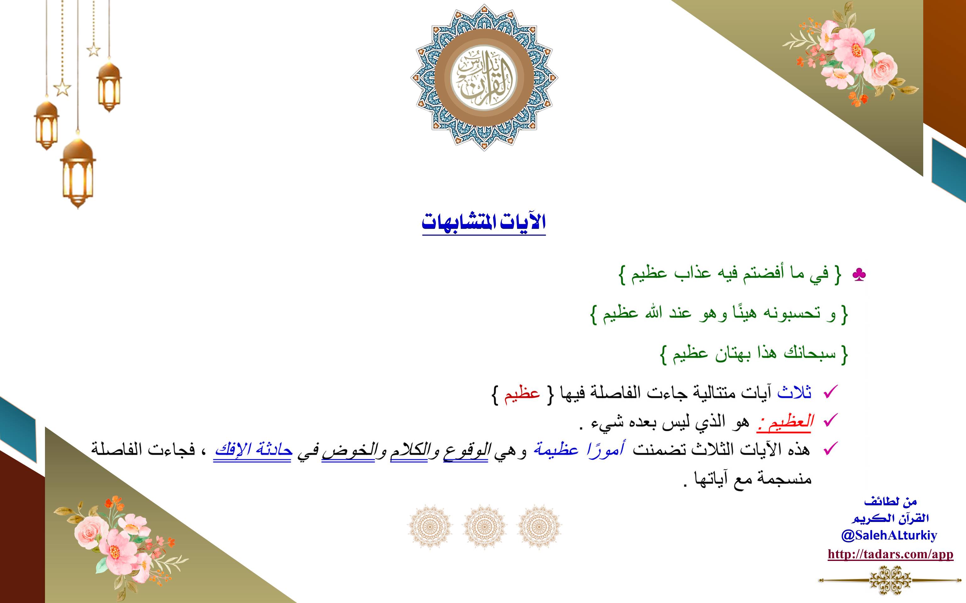 (العظيم): هو الذي ليس بعده شيء. هذه الآيات الثلاث تضمنت أمورًا عظيمة وهي الوقوع والكلام والخوض في حادثة الإفك، فجاءت الفاصلة منسجمة مع آياتها.
