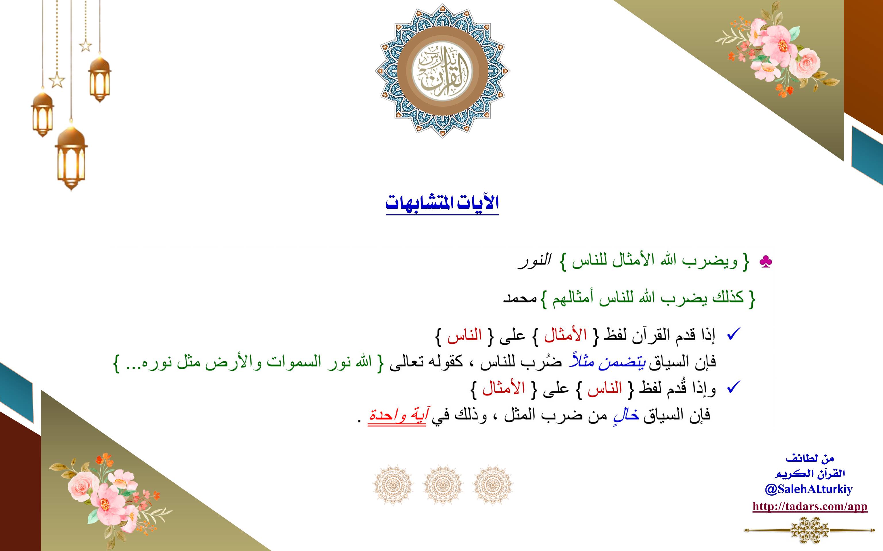 إذا قدم القرآن لفظ {الأمثال} على {الناس} فإن السياق يتضمن مثلاً ضُرب للناس؛ كقوله تعالى: {اللَّهُ نُورُ السَّمَاوَاتِ وَالْأَرْضِ مَثَلُ نُورِهِ...}.