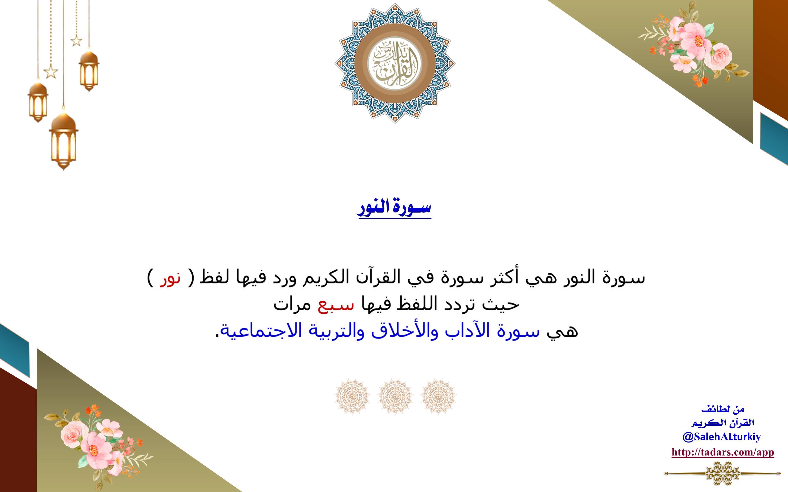 • سورة النور هي أكثر سورة في القرآن الكريم ورد فيها لفظ (نور)؛ حيث تردد اللفظ فيها سبع مرات.