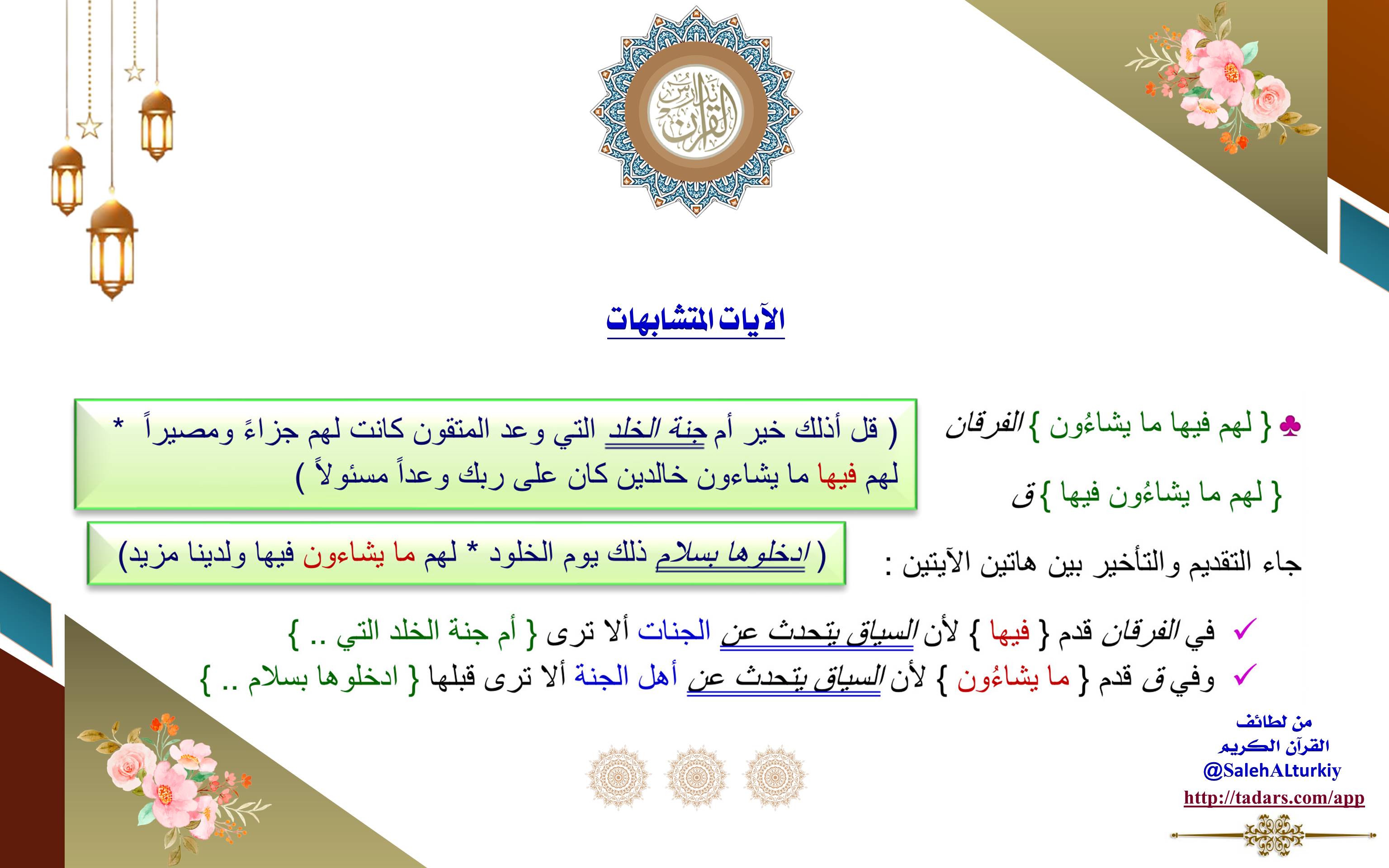 وفي ق قدم {ما يشاءون} لأن السياق يتحدث عن أهل الجنة ألا ترى قبلها {ادخلوها بسلام..}.