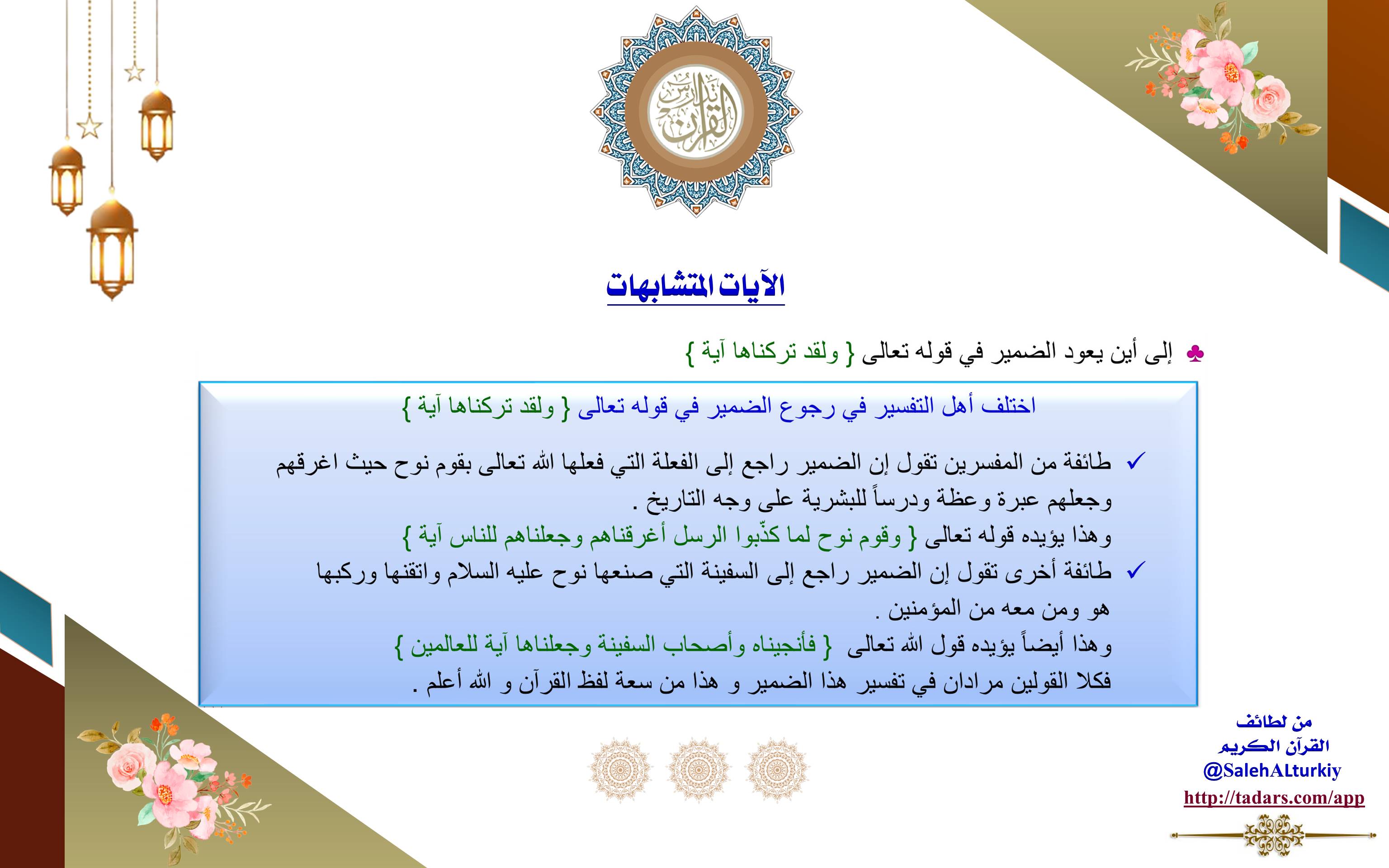 • طائفة أخرى تقول إن الضمير راجع إلى السفينة التي صنعها نوح عليه السلام واتقنها وركبها هو ومن معه من المؤمنين؛ وهذا أيضاً يؤيده قول الله تعالى: {فَأَنجَيْنَاهُ وَأَصْحَابَ السَّفِينَةِ وَجَعَلْنَاهَا آيَةً لِّلْعَالَمِينَ}.