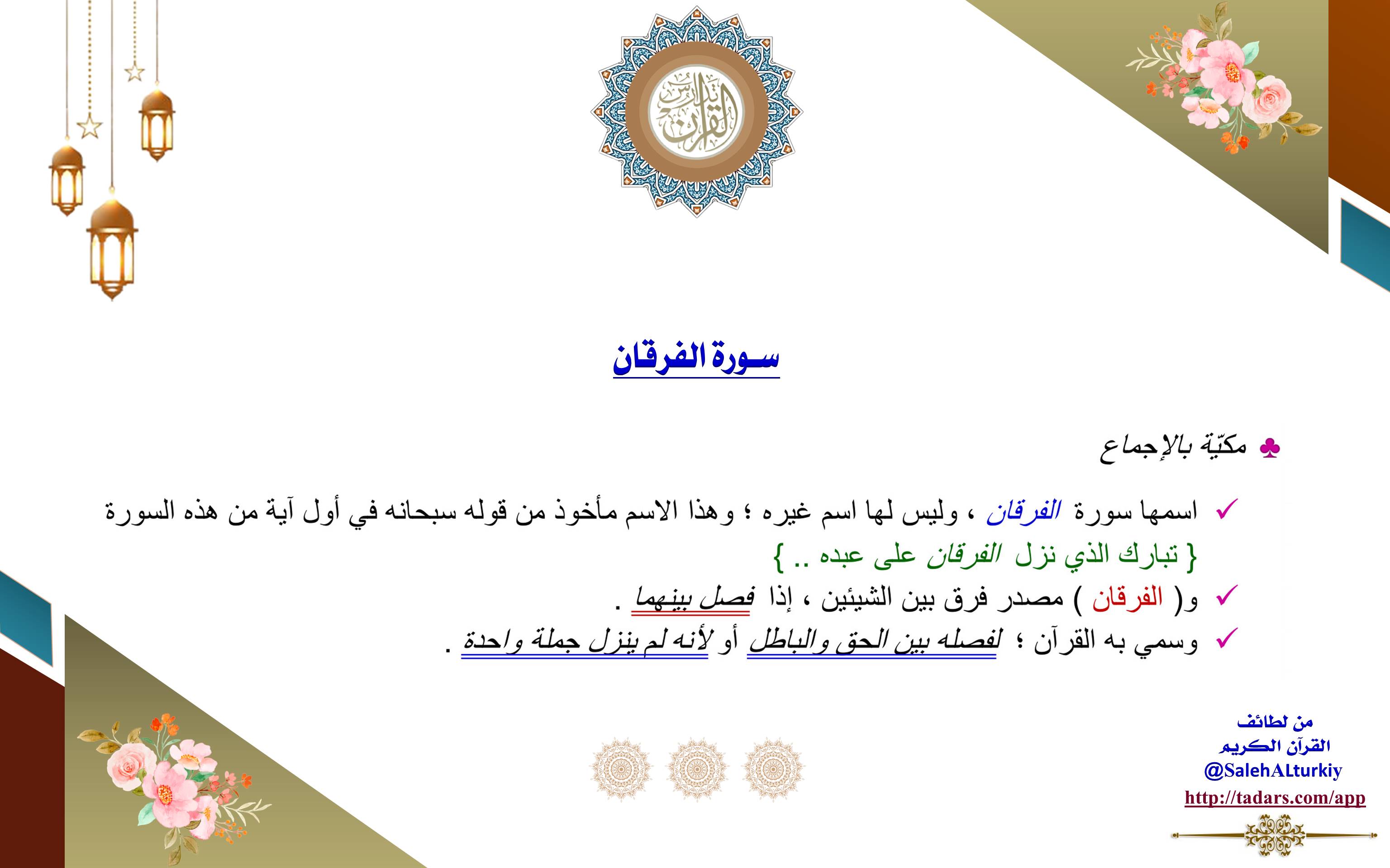 اسمها سورة الفرقان، وليس لها اسم غيره؛ وهذا الاسم مأخوذ من قوله سبحانه في أول آية من هذه السورة: {تَبَارَكَ الَّذِي نَزَّلَ الْفُرْقَانَ عَلَى عَبْدِهِ..}.