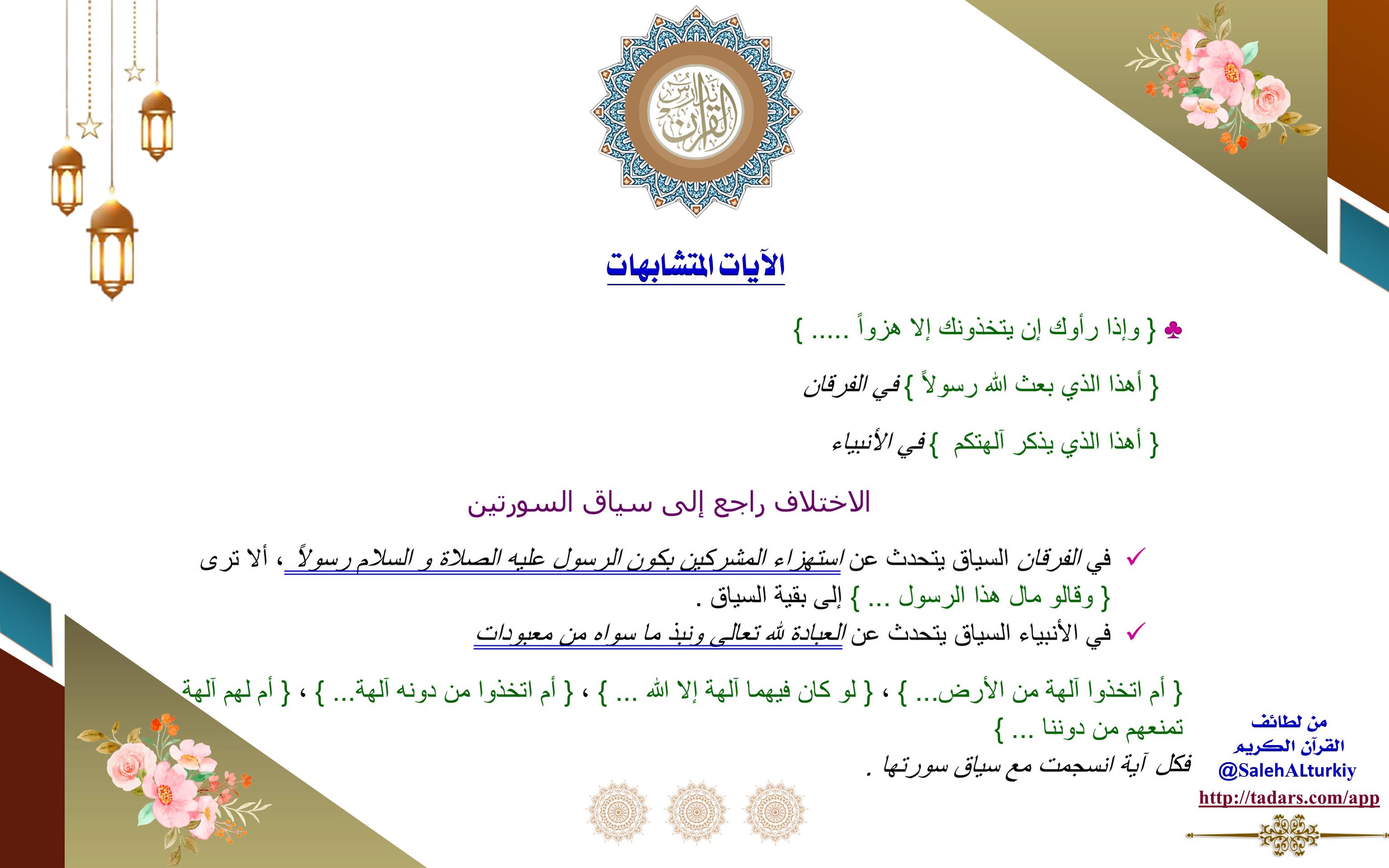 في (الفرقان) السياق يتحدث عن استهزاء المشركين بكون الرسول عليه الصلاة و السلام رسولاً، ألا ترى {وَقَالُوا مَالِ هَٰذَا الرَّسُولِ..} إلى بقية السياق.