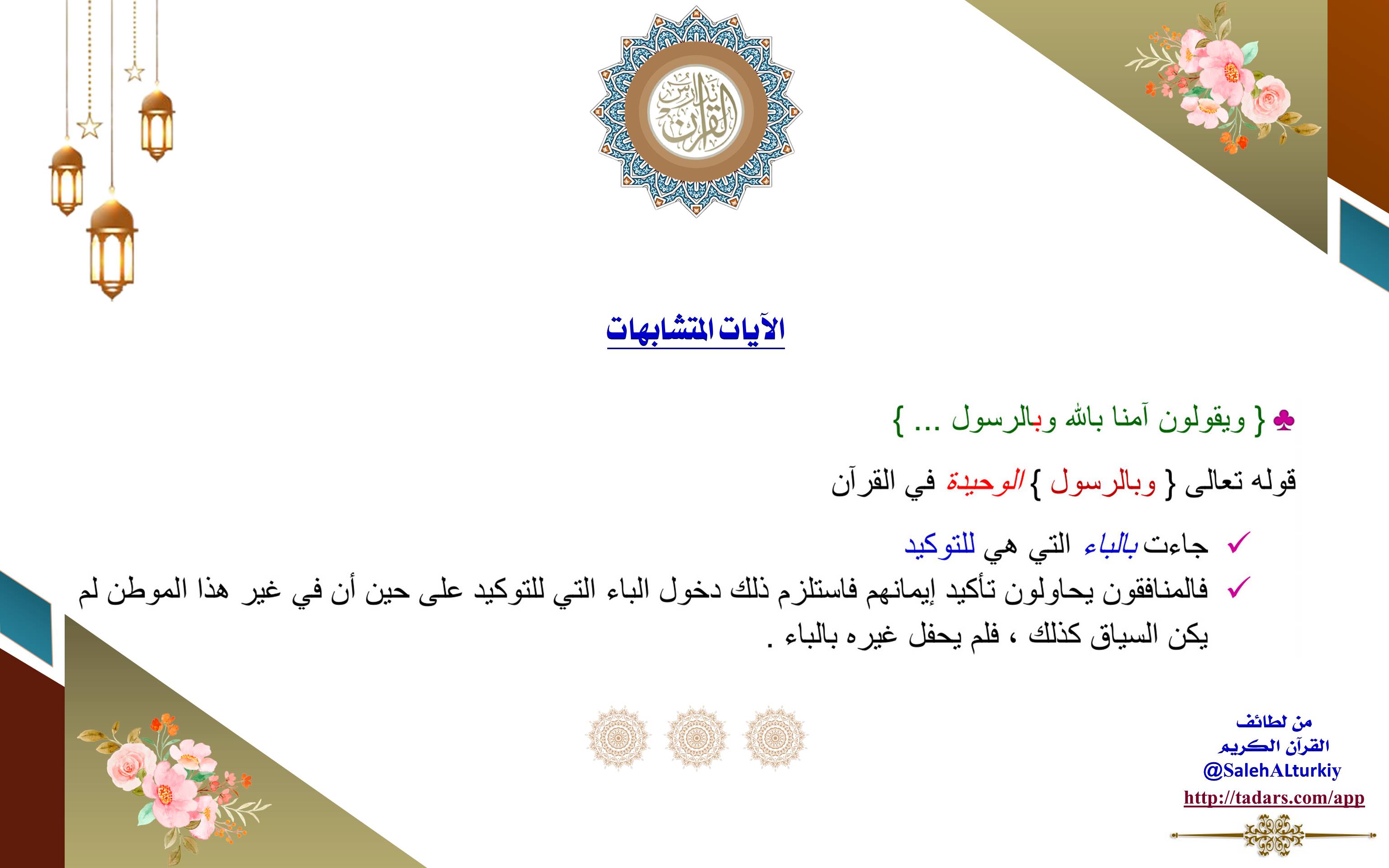 قوله تعالى: {وبالرسول} الوحيدة في القرآن؛ جاءت بالباء التي هي للتوكيد، فالمنافقون يحاولون تأكيد إيمانهم فاستلزم ذلك دخول الباء التى للتوكيد على حين أن في غير هذا الموطن لم يكن السياق كذلك، فلم يحفل غيره بالباء.